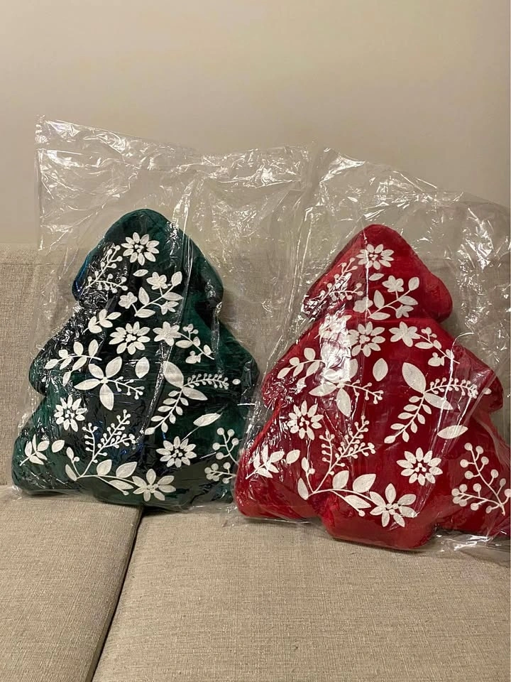 Two Christmas tree shaped pillows, one red and one green, both with a white floral design. Still in original packaging. Great for holiday decor.