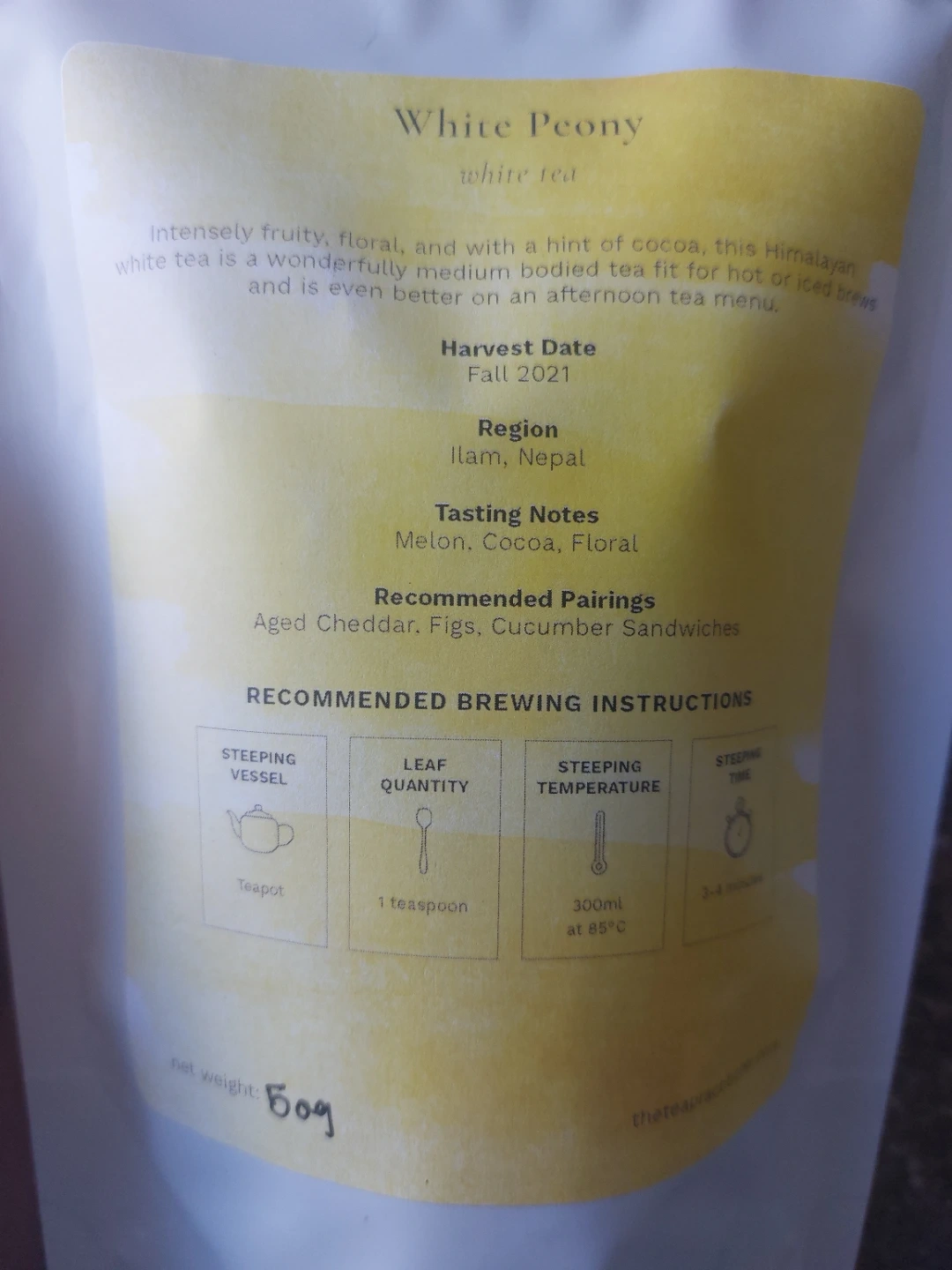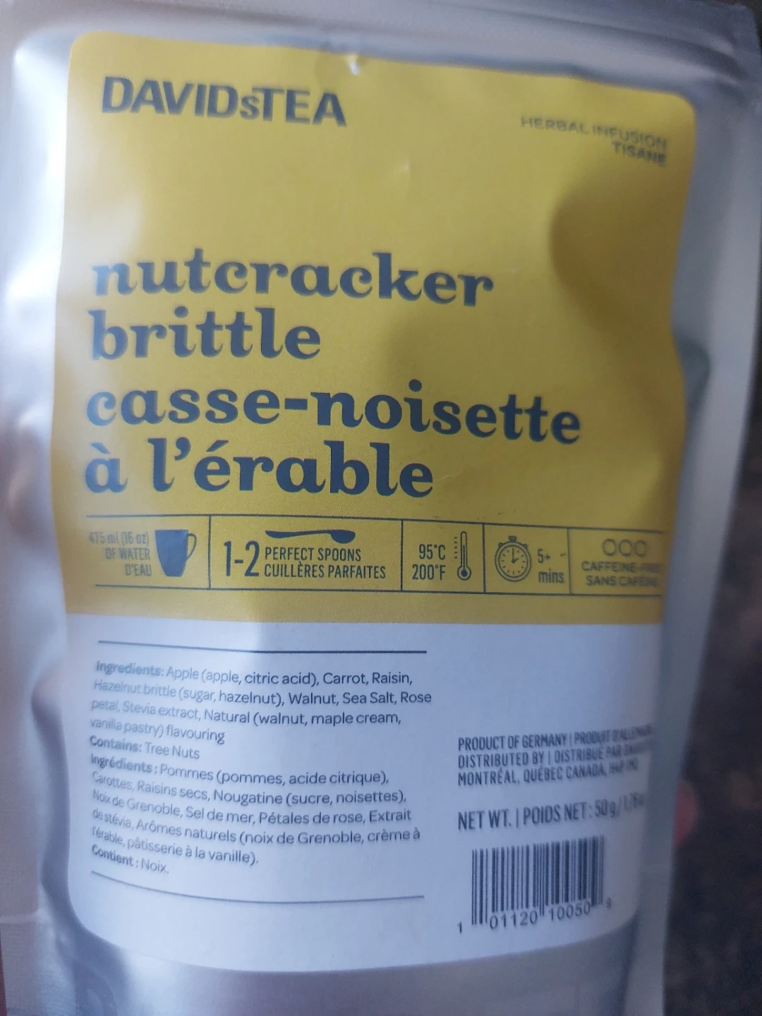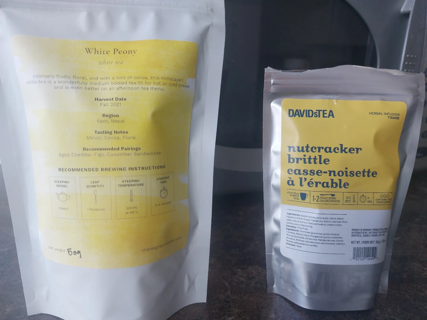 Both teas are just under 50 g. DAVIDsTEA Nutcracker Brittle is a herbal infusion tea. It contains Apple, Carrot, Raisin, Hazelnut brittle, Sea Salt, Rose petal, and Vanilla flavouring. Tree Nuts are present in the ingredients. One serving gone. White peony is down two servings.