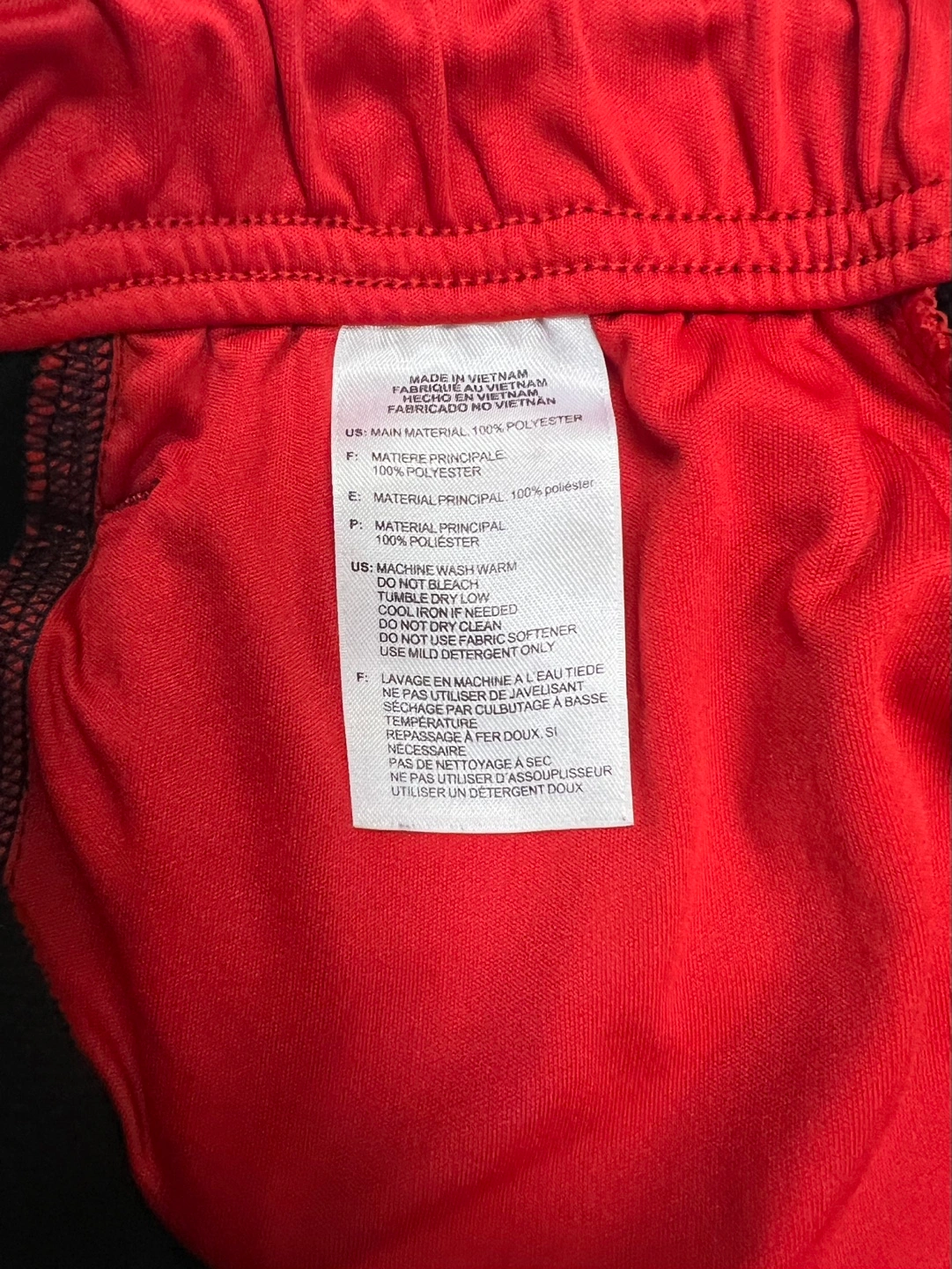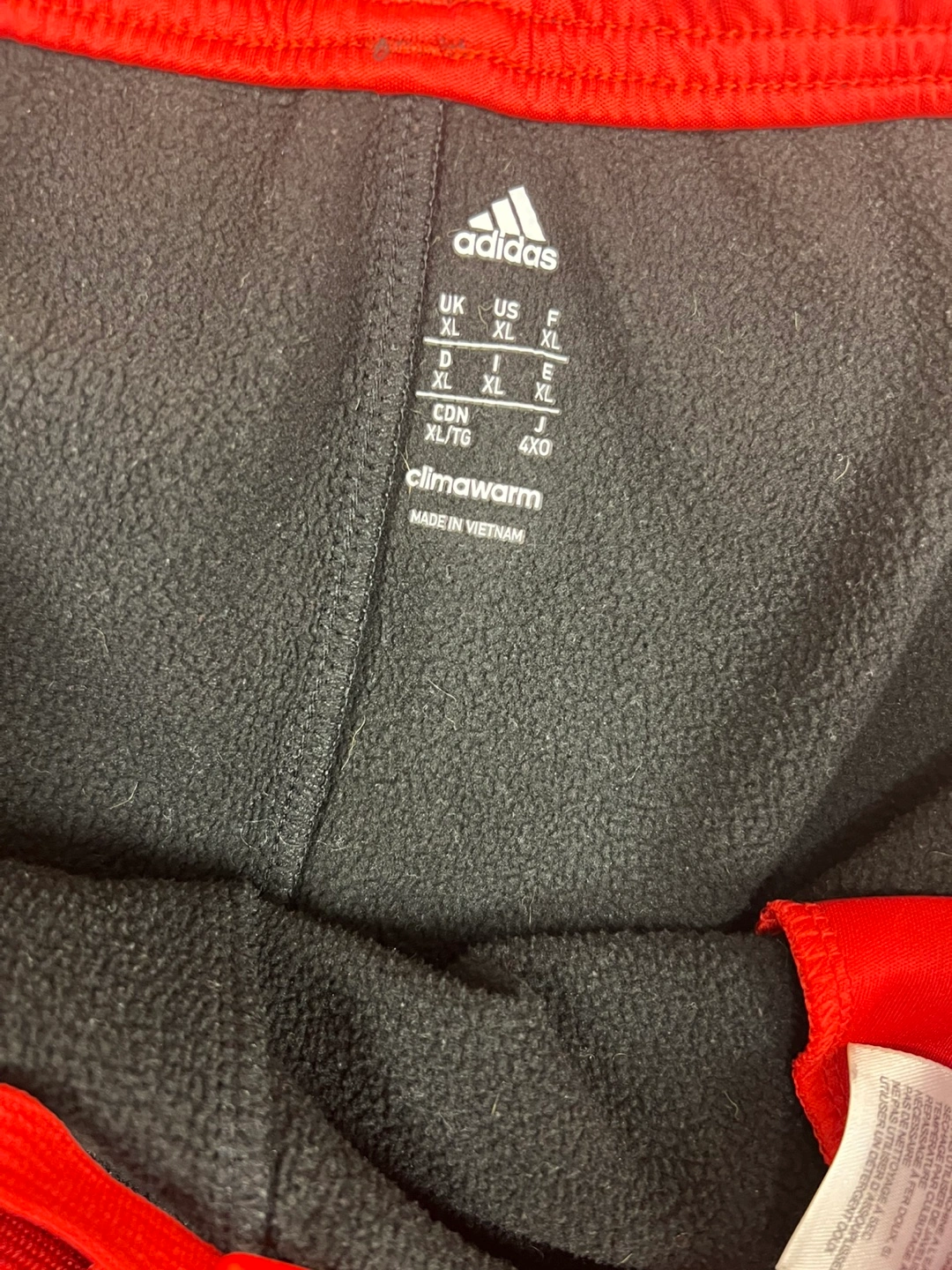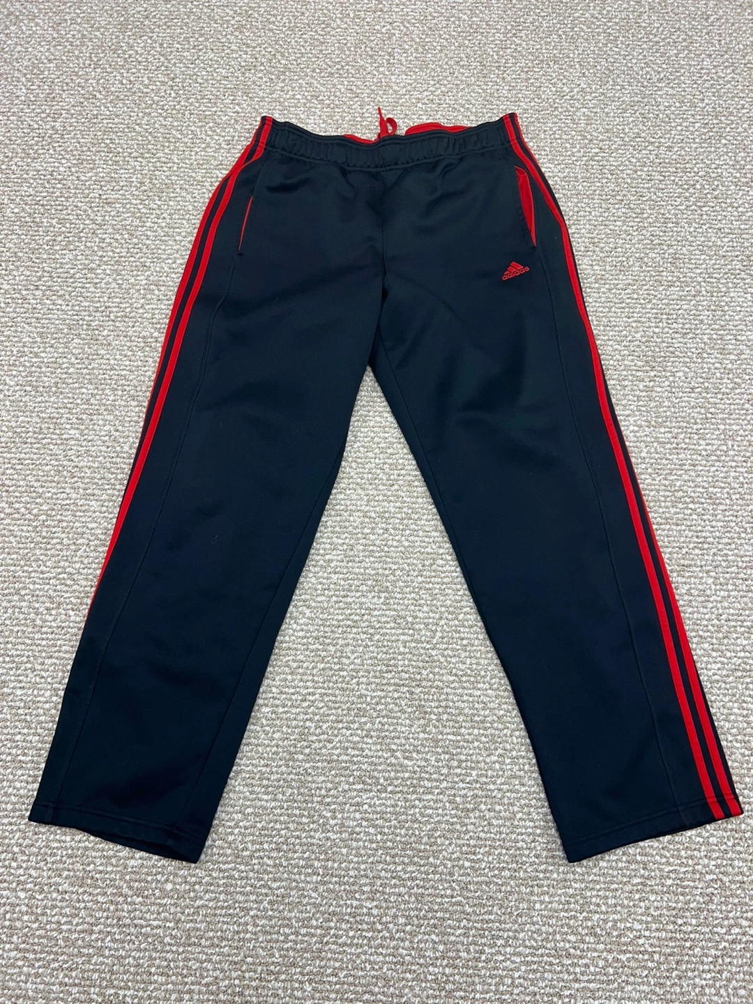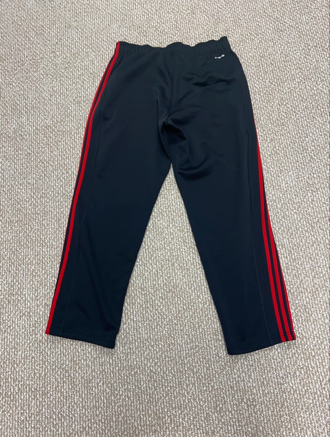 Men's Adidas Climalite track pants. Size XL. Black with red stripes. 100% polyester. Made in Vietnam. Drawstring waist. Side pockets.