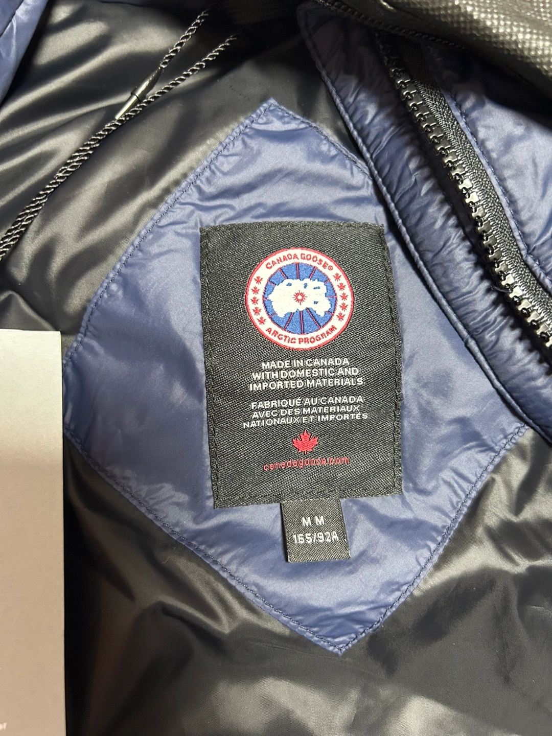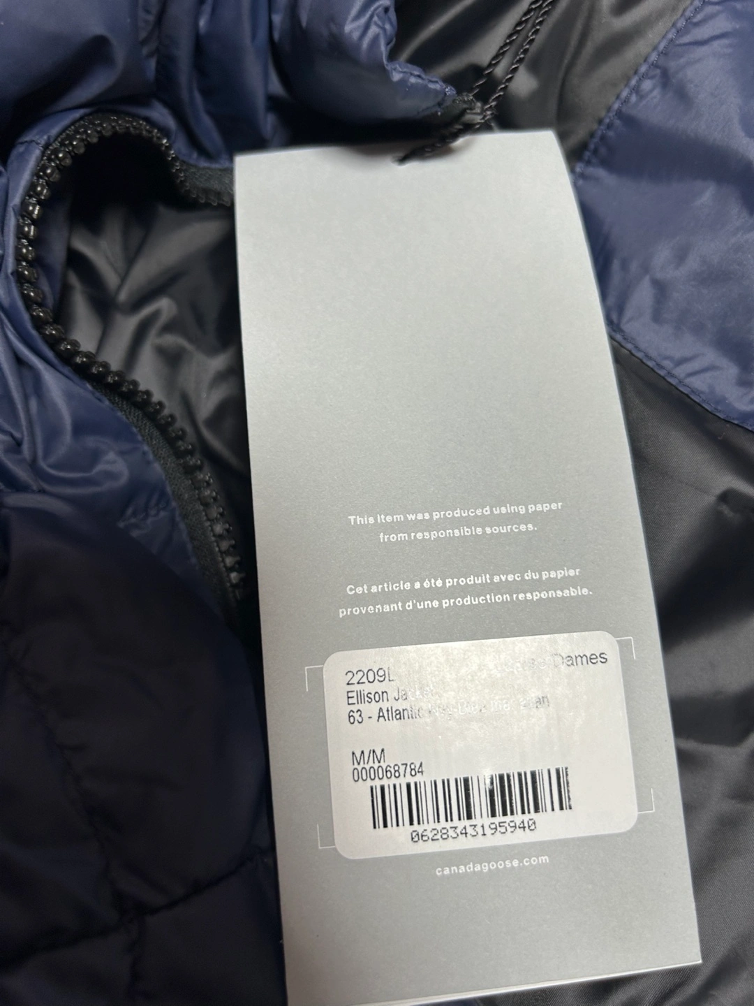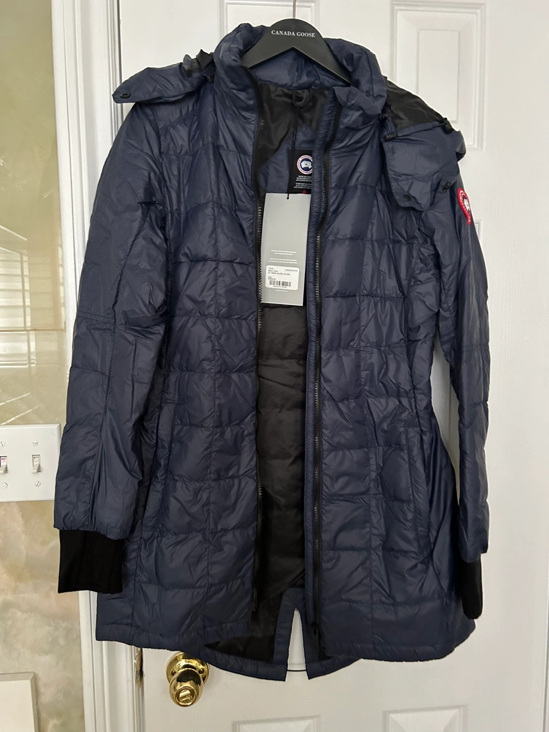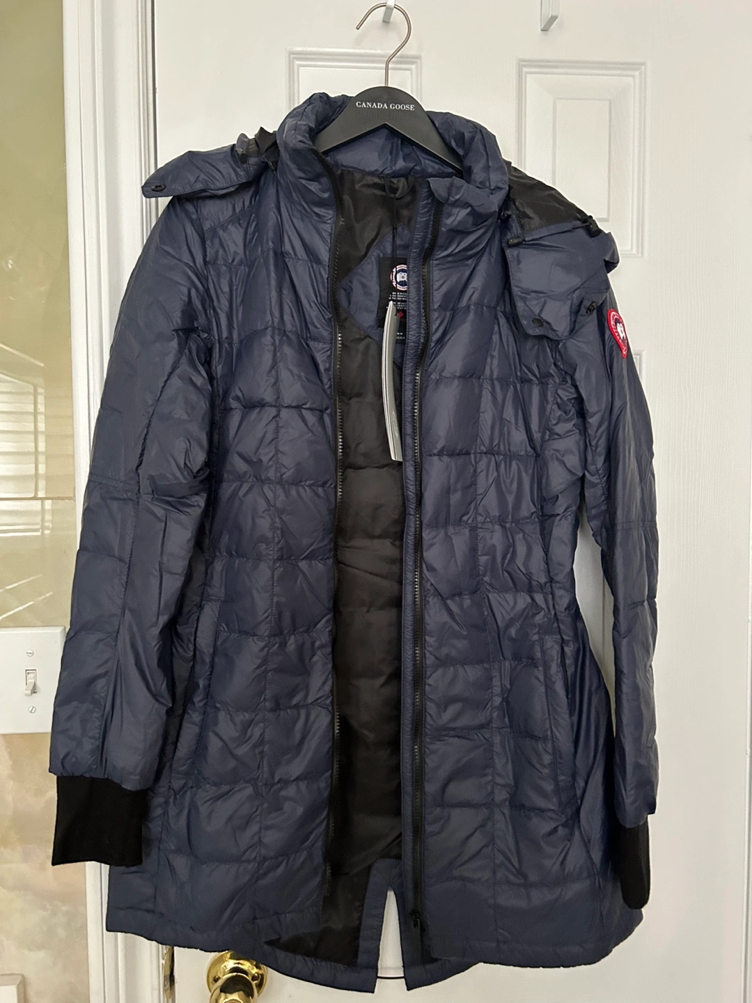 A stylish navy blue jacket. Features a zipper closure and a hood. Could be a wonderful item to wear on your next outing on a cold day.