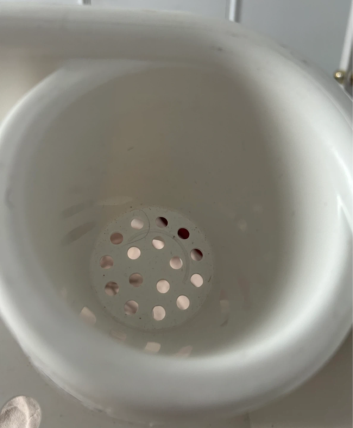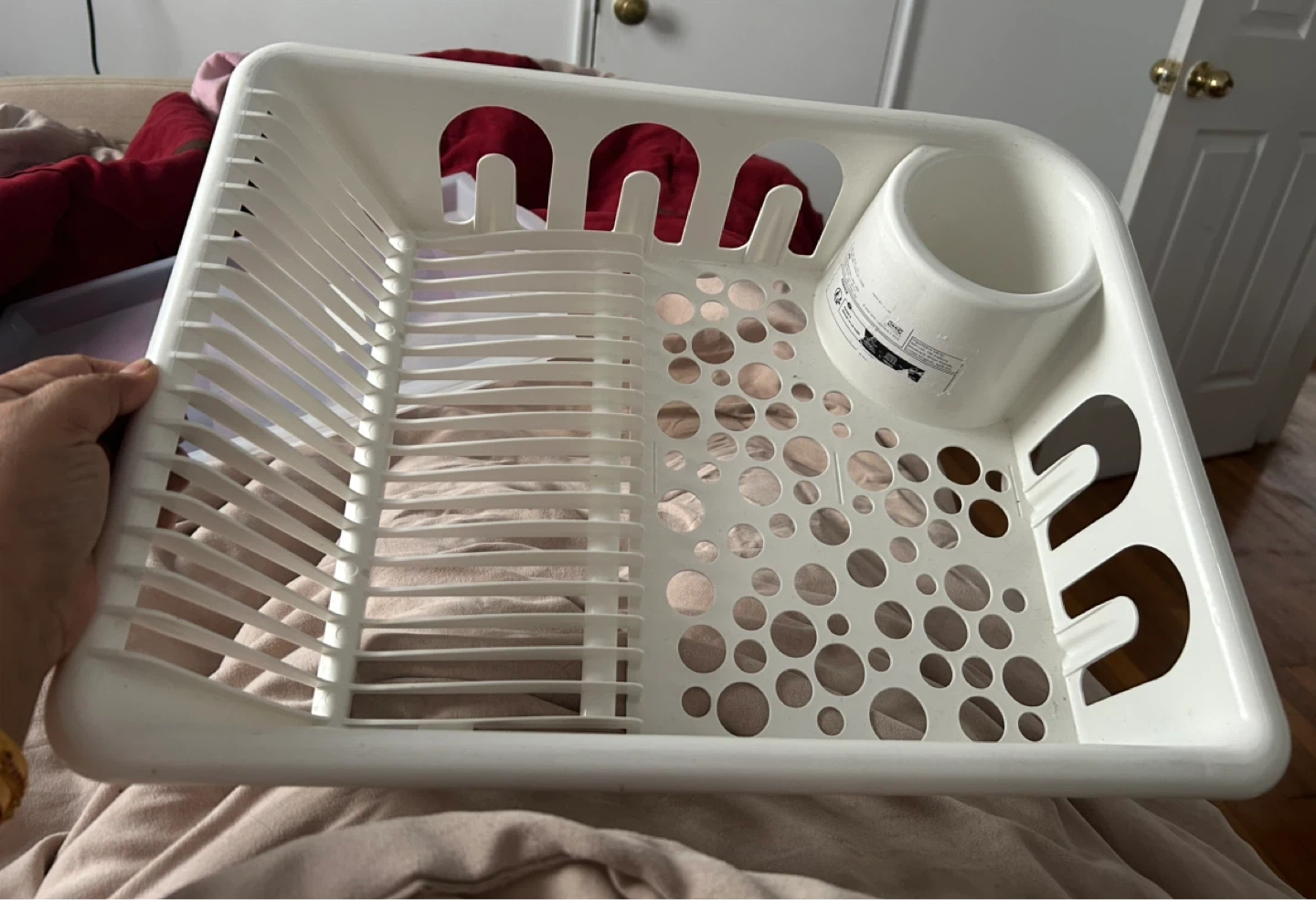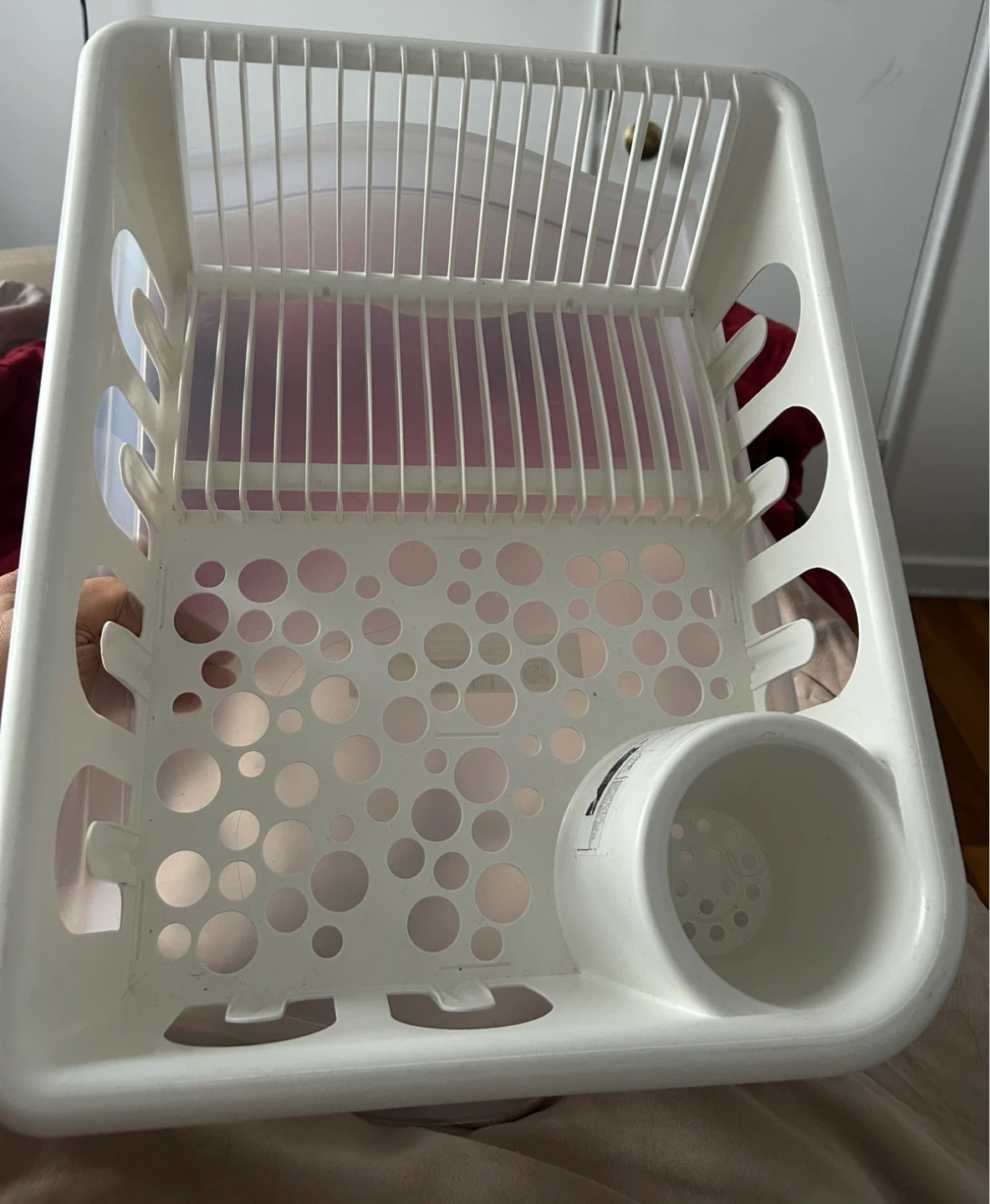 This white plastic dish drying rack includes a removable utensil holder. It's designed with drainage holes to keep dishes dry. This rack is useful for any kitchen needing extra drying space.