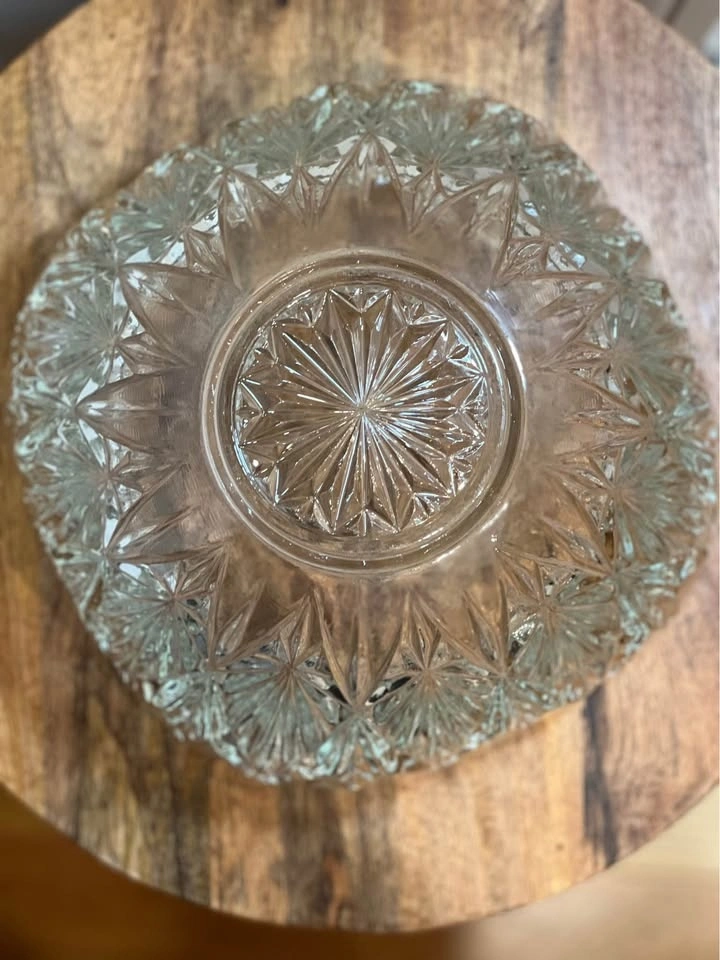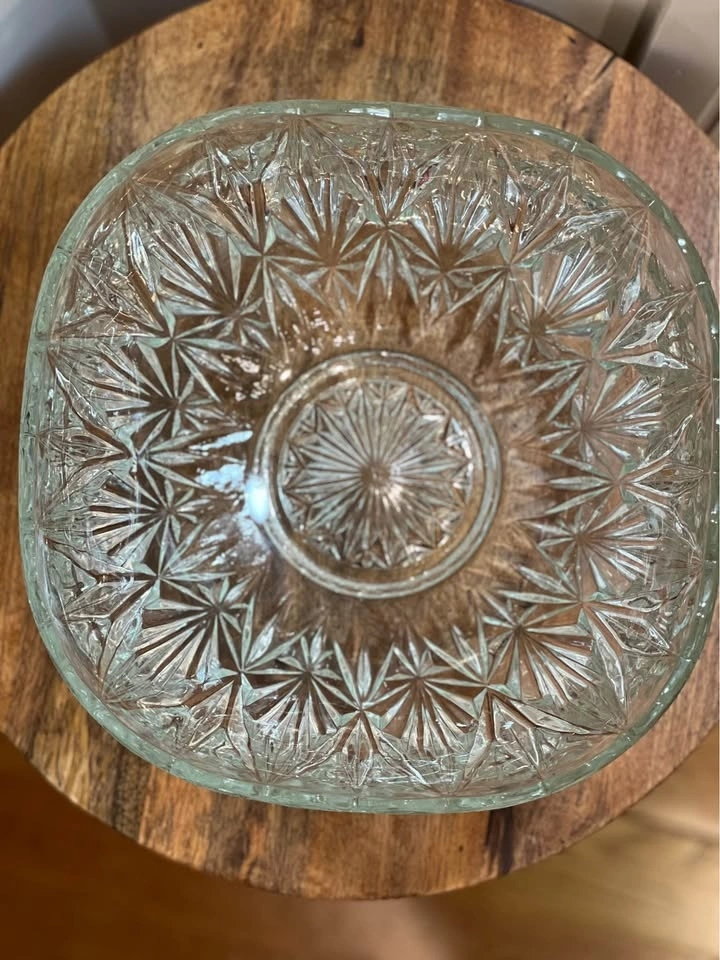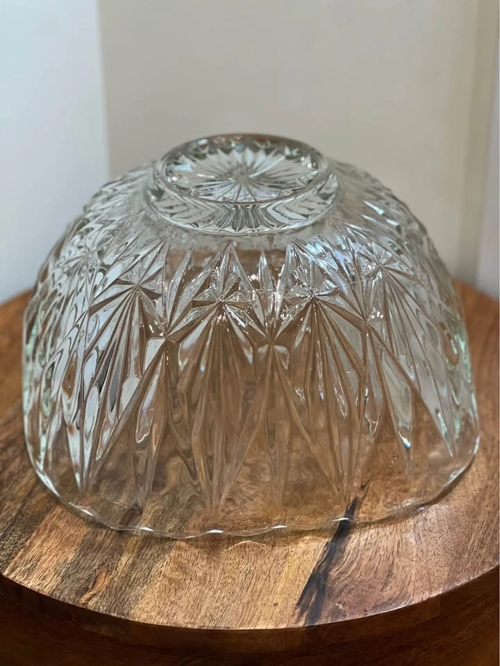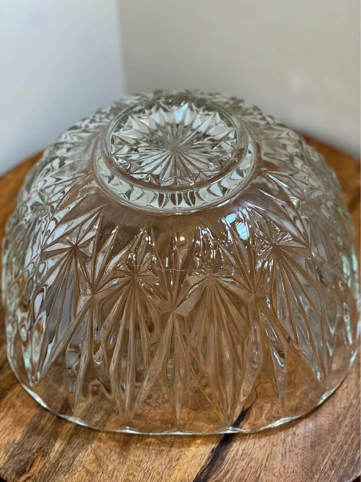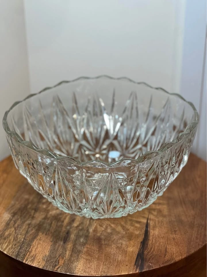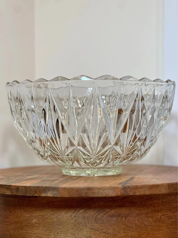 This is an elegant Williamsport Clear Punch Bowl by Hazel-Atlas. It's a classic mid-century pressed glass piece with a deep-cut geometric pattern and a scalloped rim. It was designed as a punch bowl but also works great as a large serving bowl for salads or fruit. Pickup is at 58th and 7th Ave in Midtown Manhattan.