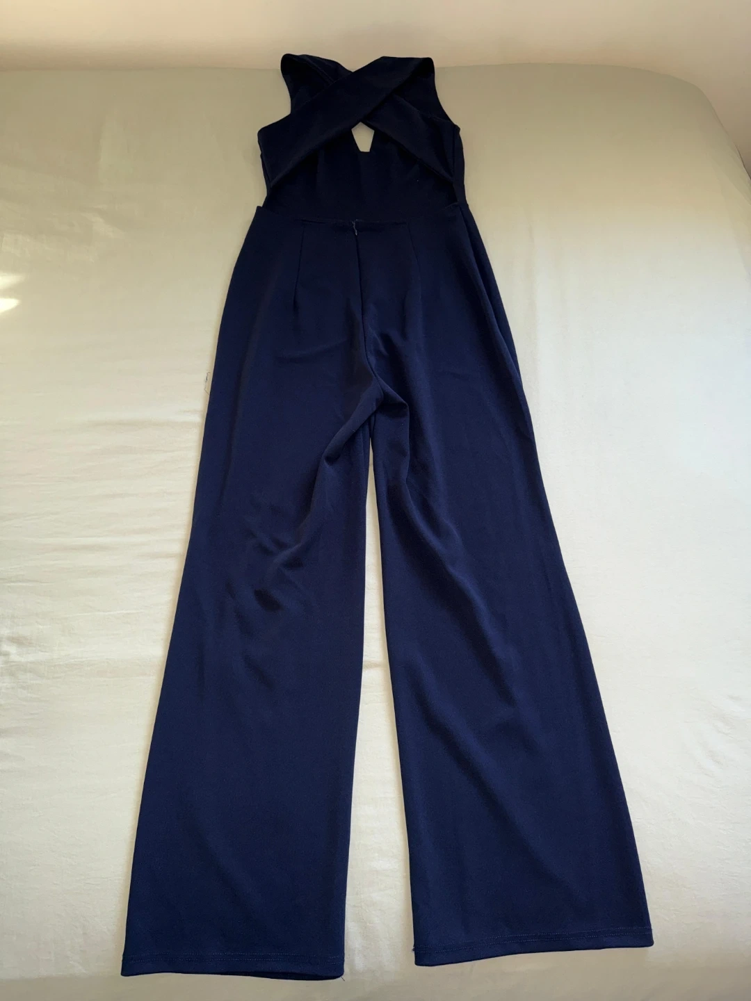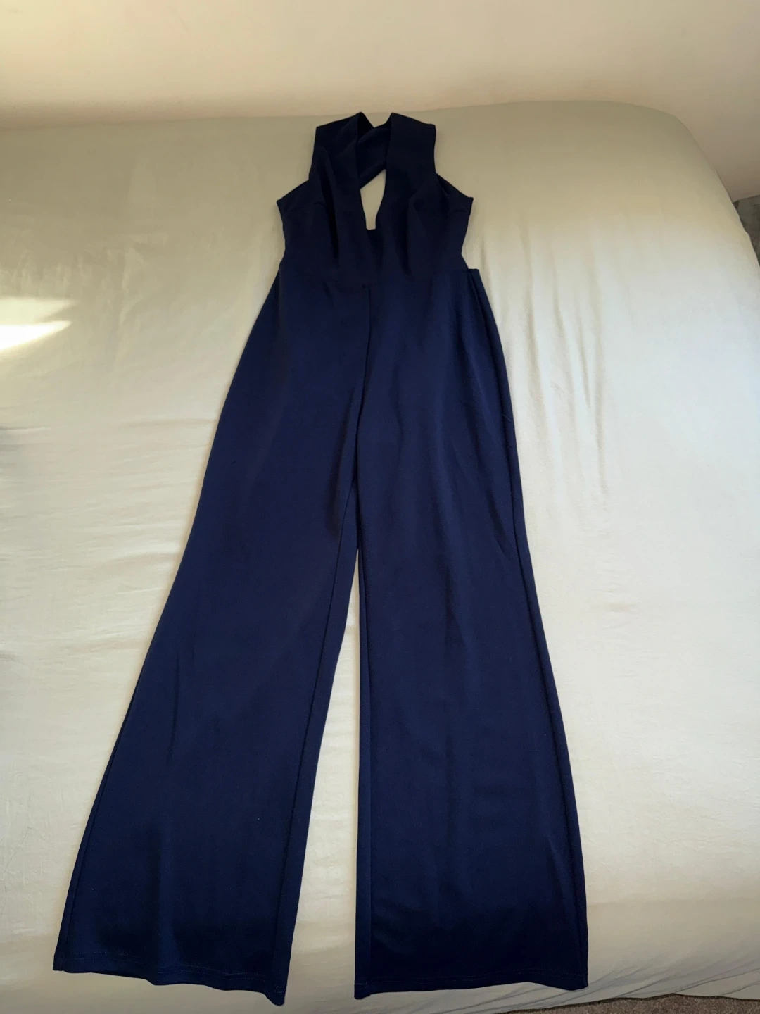 Selling a navy blue jumpsuit. It's in great condition and ready for a new owner! The jumpsuit features a halter neck and wide-leg pants.