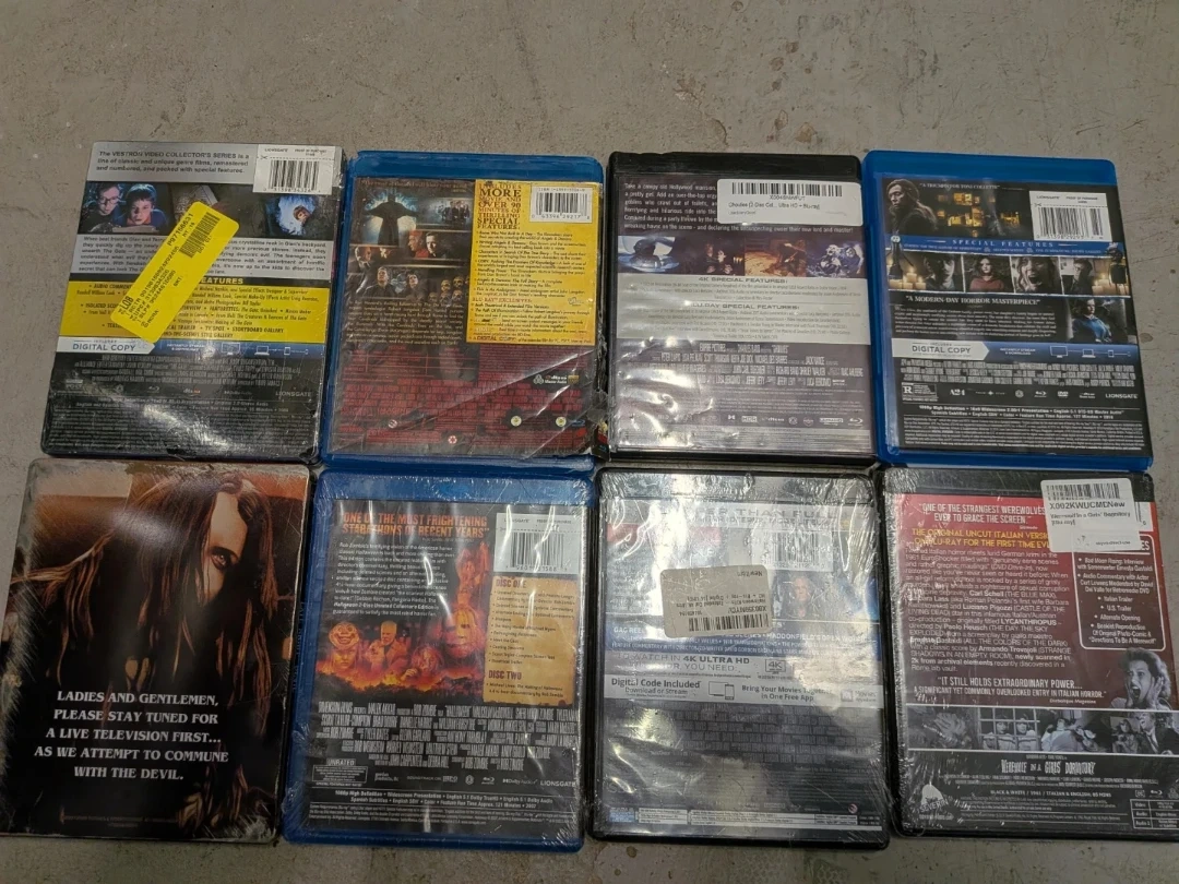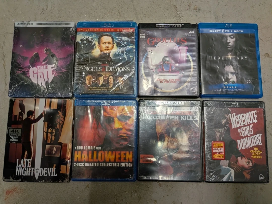 This lot includes 8 sealed horror movies on Blu-ray, featuring titles like The Gate, Angels & Demons, Ghoulies, Hereditary, Late Night With The Devil, Halloween, Halloween Kills, and Werewolf in a Girls Dormitory. These are all new and unopened. A great collection for any horror fan!