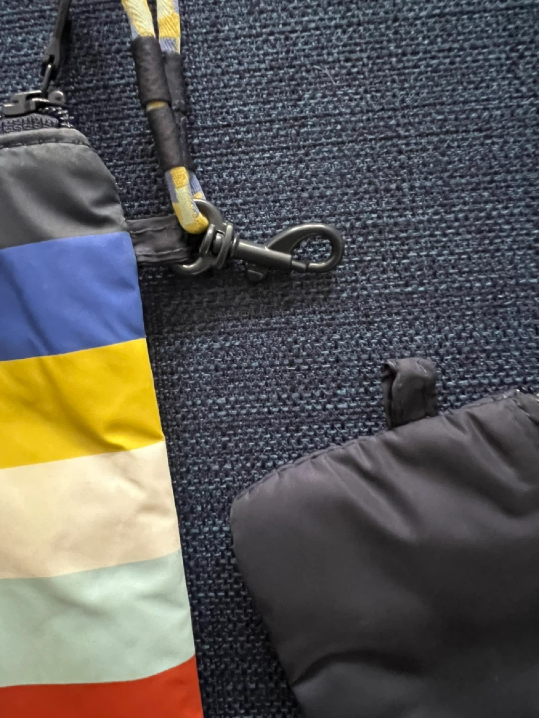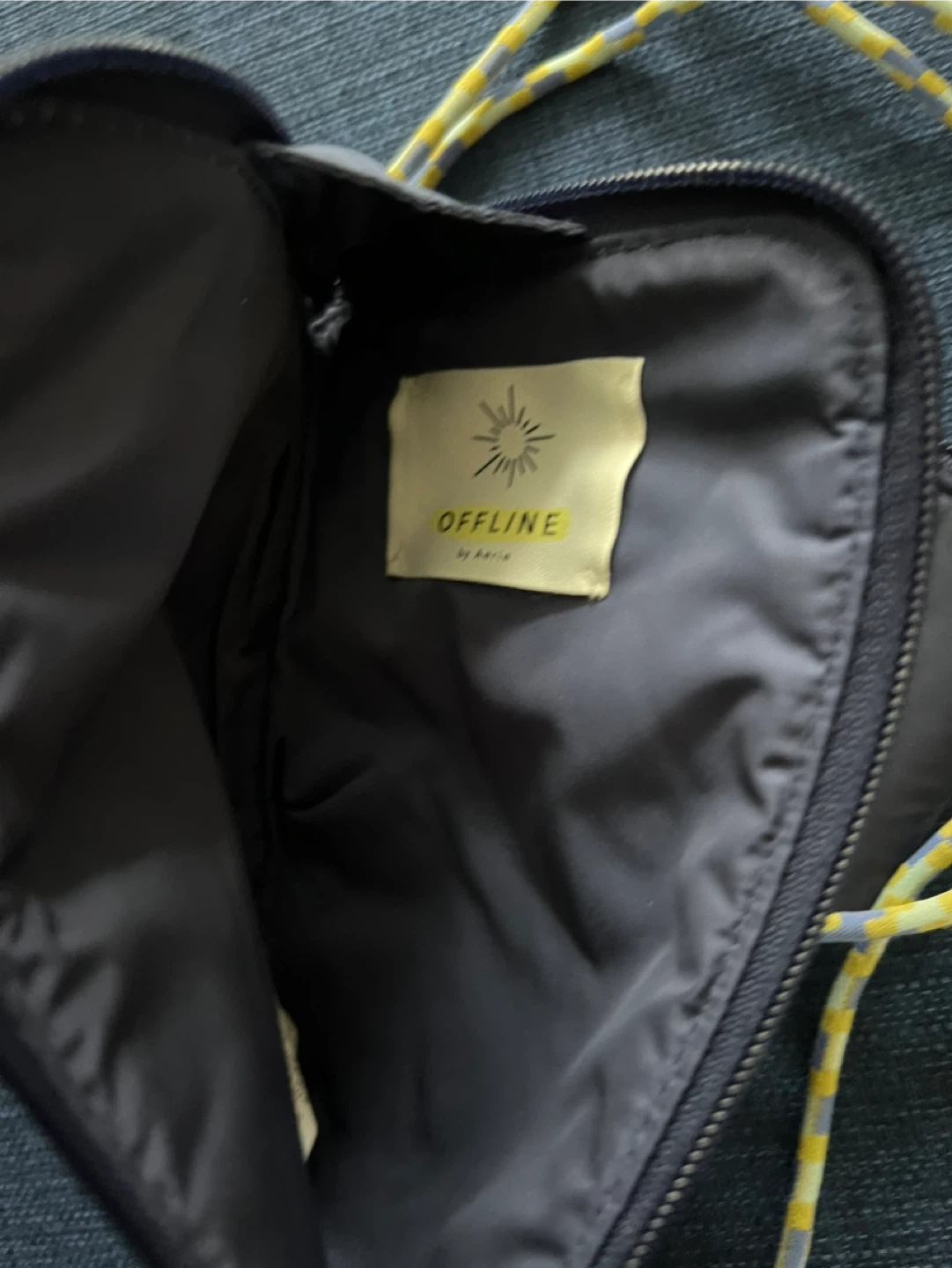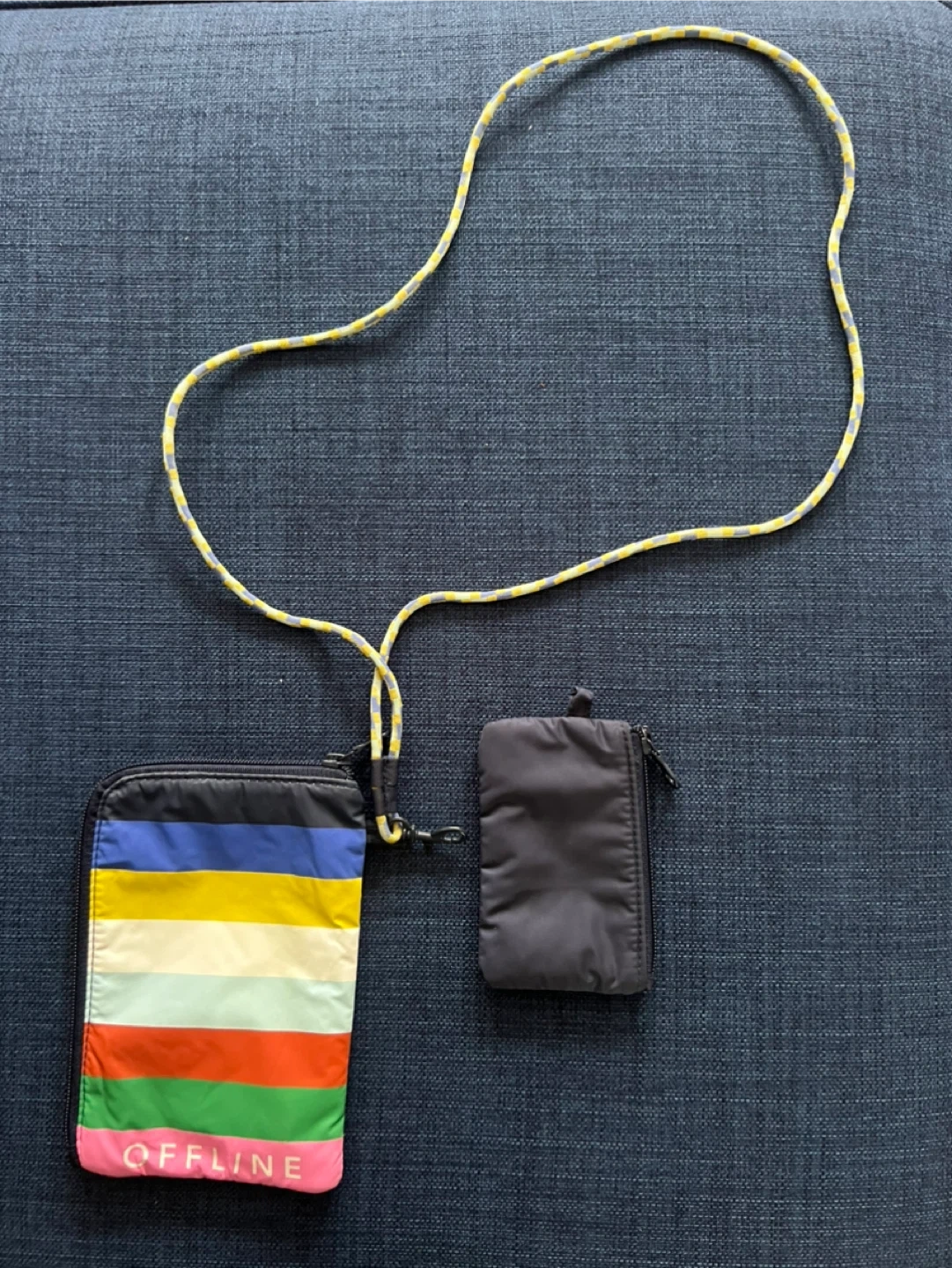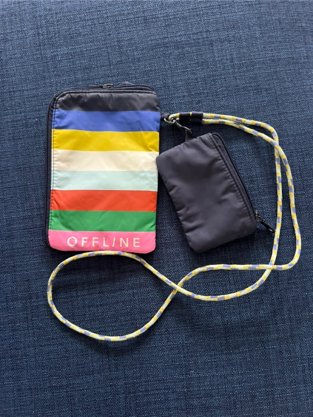 This set includes a colorful striped pouch and a smaller dark blue pouch, both with zippers. It comes with a lanyard that attaches to both. The larger pouch has the wording "OFFLINE" printed vertically on a pink stripe. It's a great way to keep essentials organized on a walk or a hike. Bigger pouch fits a cell phone.