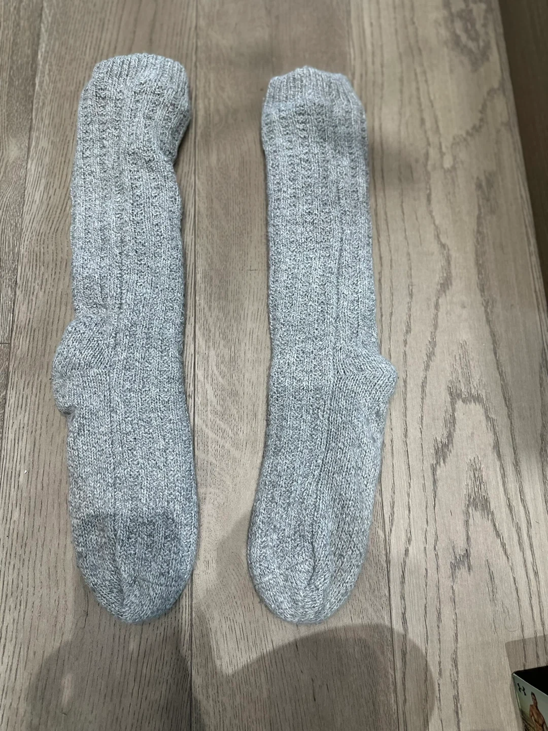 They're made of a soft, knit material. These socks are great for keeping your feet warm on chilly days!