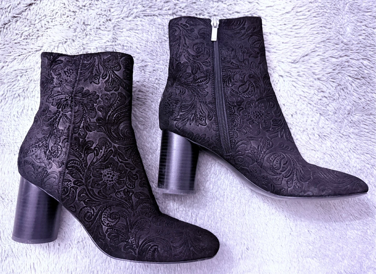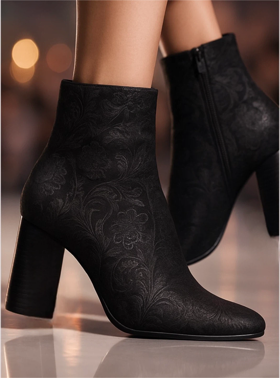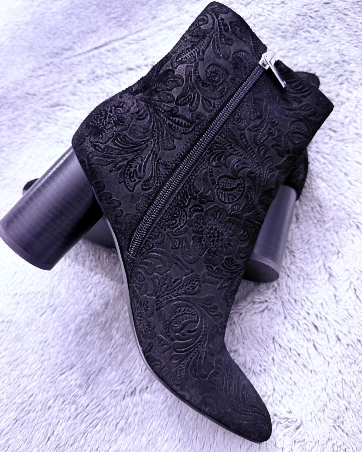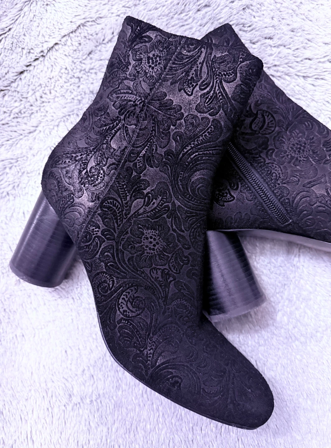Chic black ankle boots featuring a stylish embossed floral pattern. These boots have a side zipper closure and a sturdy block heel for comfortable wear. They're perfect for adding a touch of elegance to any outfit!