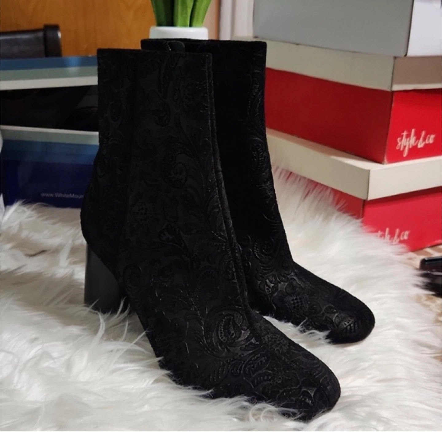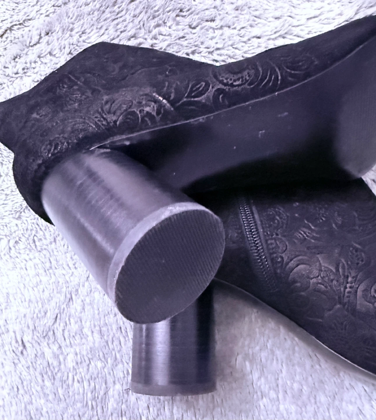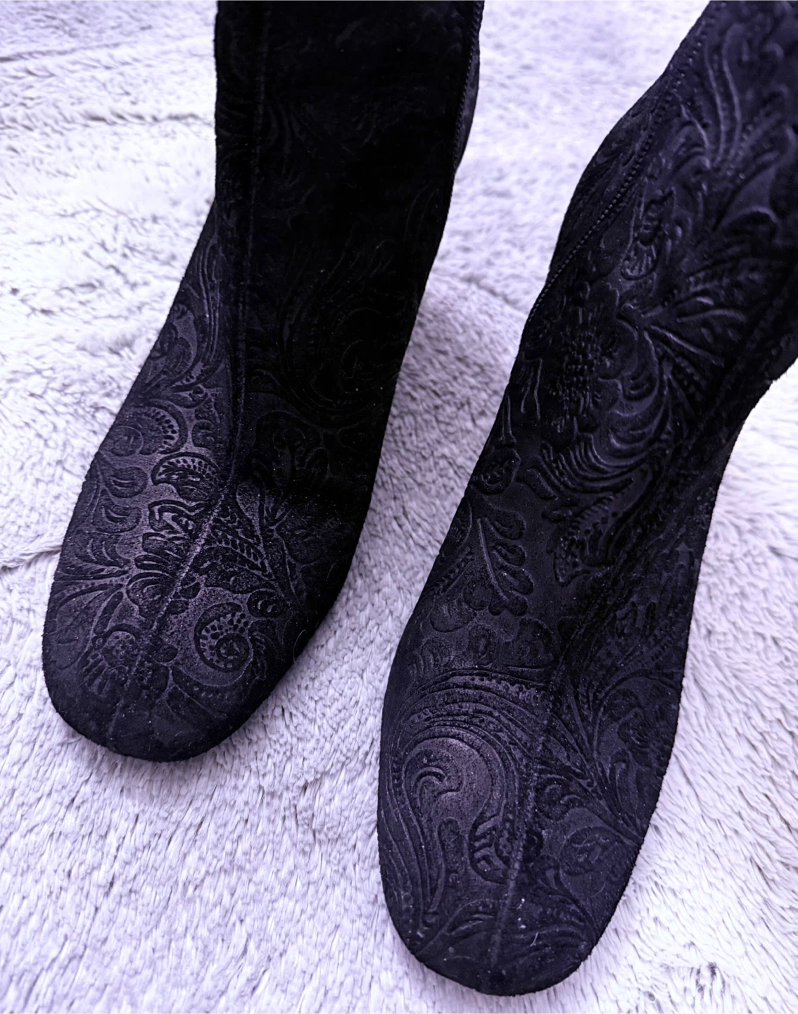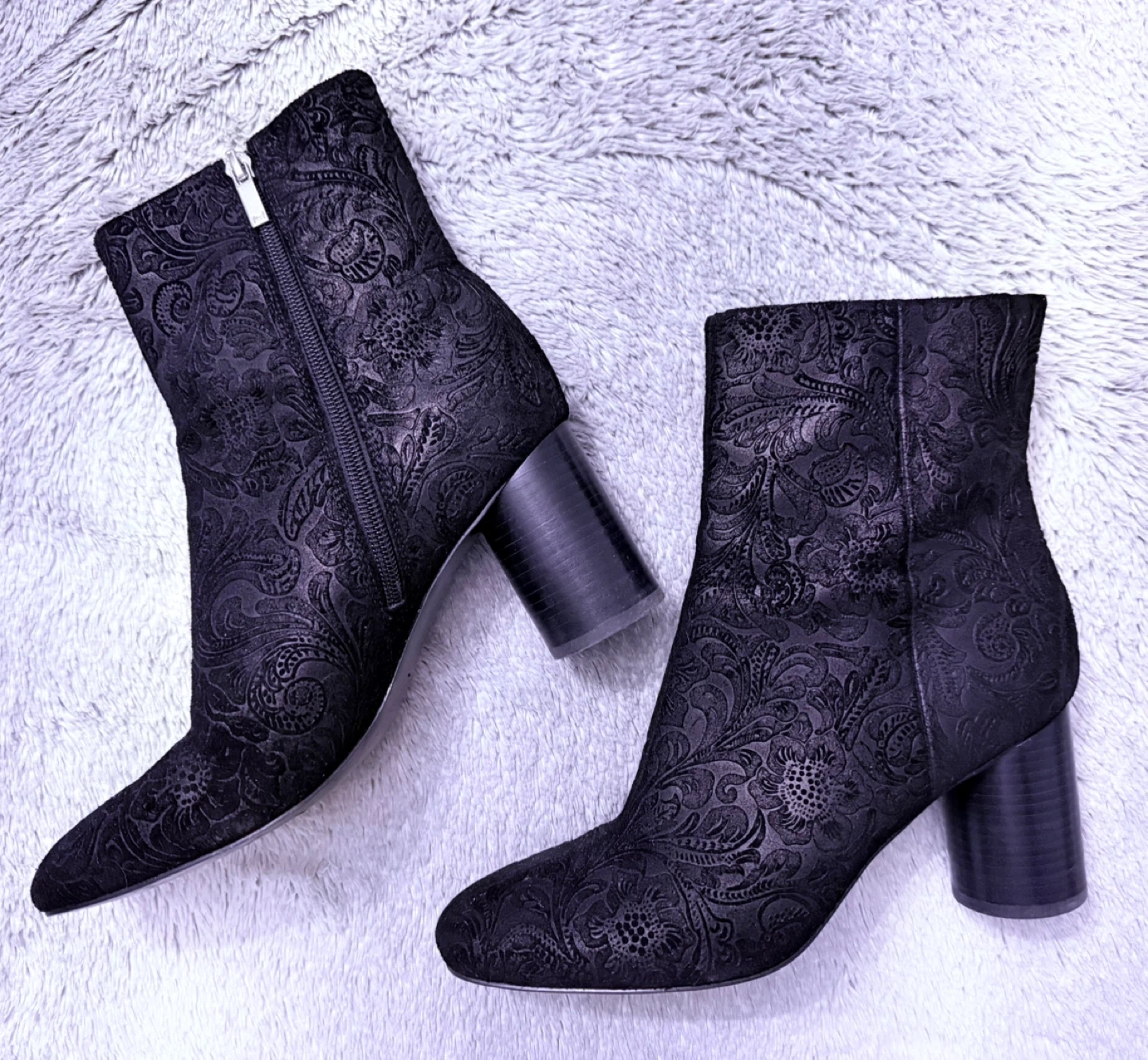 Chic black ankle boots featuring a stylish embossed floral pattern. These boots have a side zipper closure and a sturdy block heel for comfortable wear. They're perfect for adding a touch of elegance to any outfit!