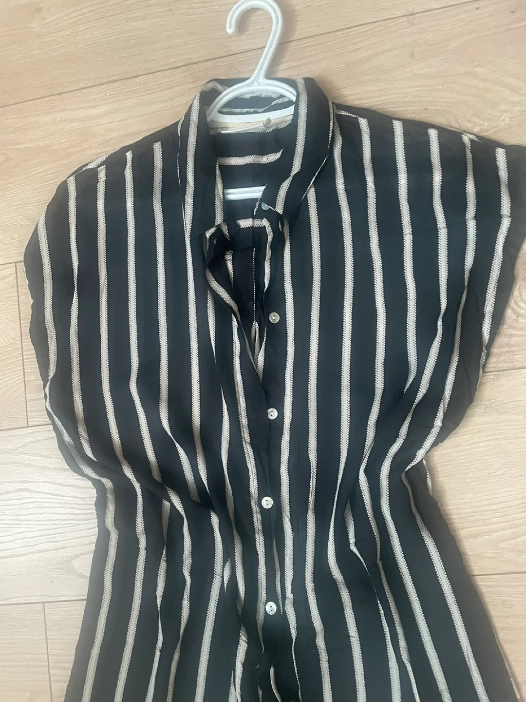 This sleeveless dress features a classic black and white stripe pattern. It has a button-up front and a collar. Size medium. Looks beautifull just wear loose no belt , very fresh and summery πŸ’œπŸ’œπŸ’œπŸ’œ