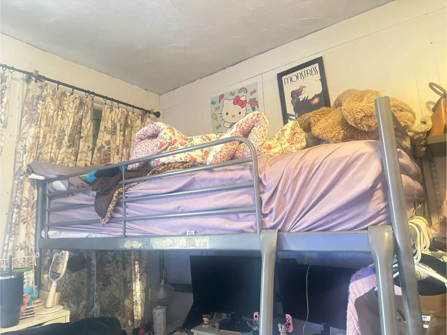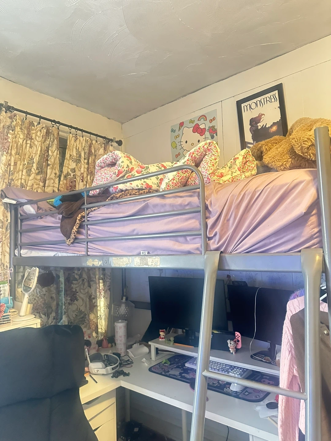 This is a metal loft bed with a It's a space-saving solution for bedrooms. The frame is silver metal and includes the guardrails. Comes with the Ladder. Pretty good condition. Twin bed. Mattress does not come with it.