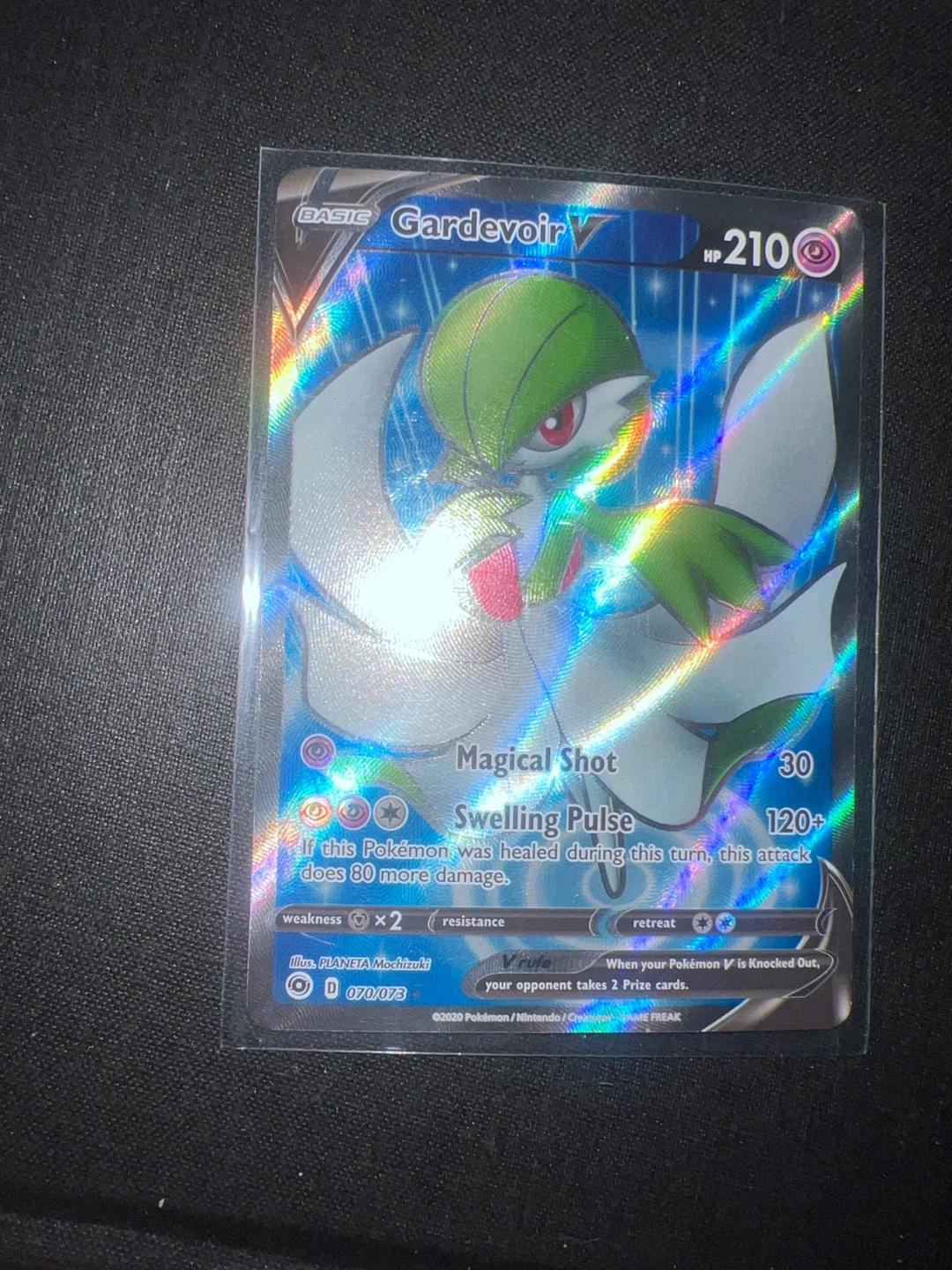 This is a Gardevoir V Pokemon card, set number 070/073. It has 210 HP and its attacks are Magical Shot for 30 damage and Swelling Pulse for 120+ damage. It's a V card with a V rule.