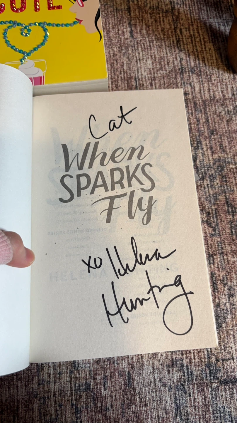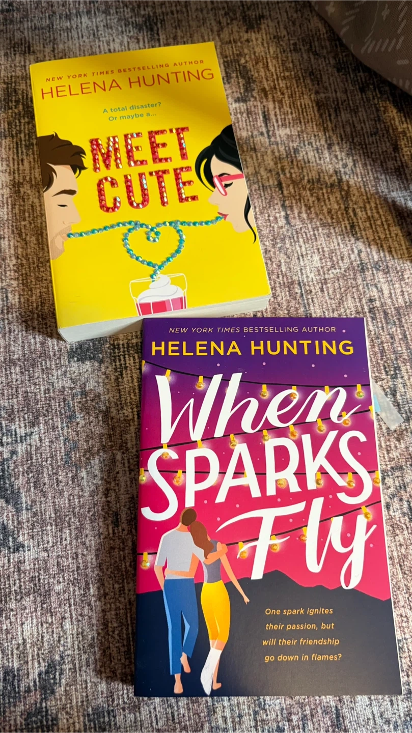 Uniquely Bedazzled covers. Two New York Times bestselling author Helena Hunting books are "When Sparks Fly" and "Meet Cute." Both books are signed copies, with "Meet Cute" containing a dedication to Helena Hunting. Perfect for romance novel fans!