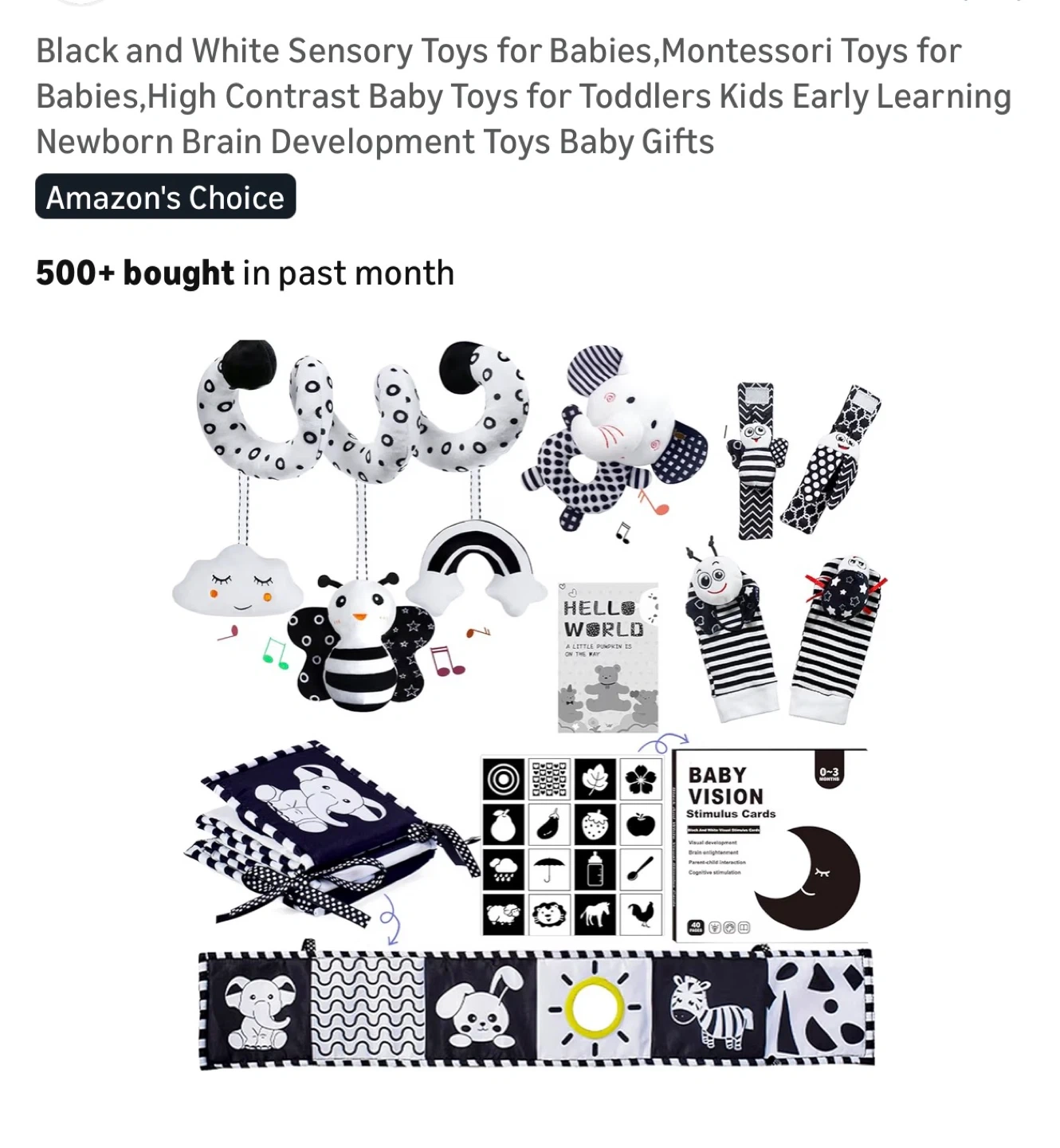 This set includes high contrast black and white sensory toys for newborns and toddlers. It features a soft book, hanging toys, and stimulus cards designed for early learning and brain development. Toys are made from fabric materials.