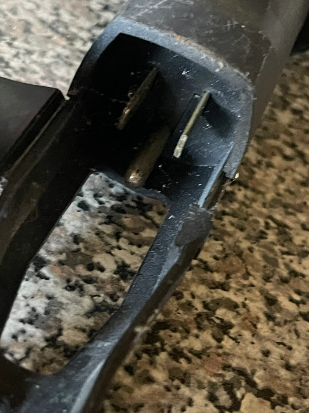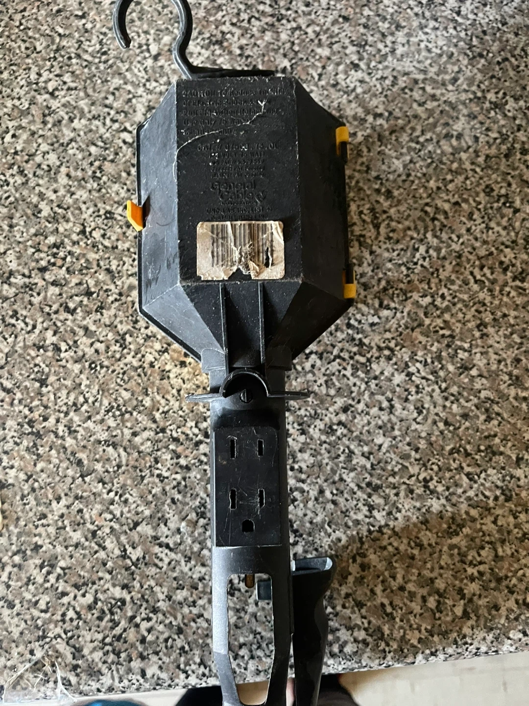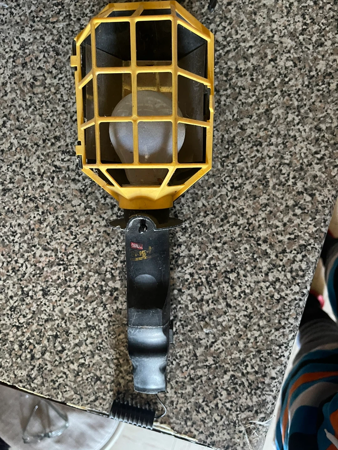 This is a DEWALT 18V cordless work light. It's black and yellow with a cage guard. It has a hook for hanging. Great for job sites or workshops!