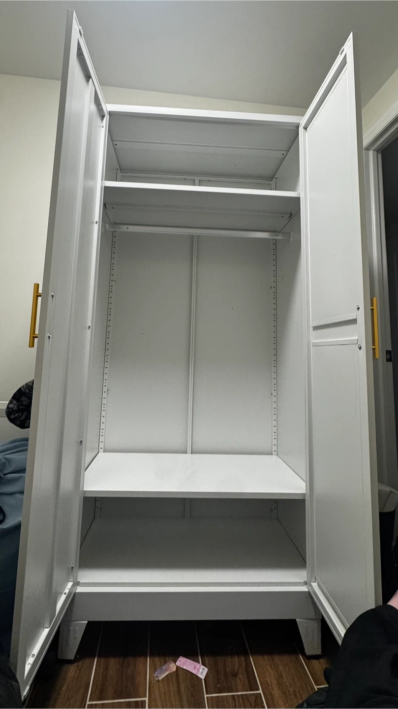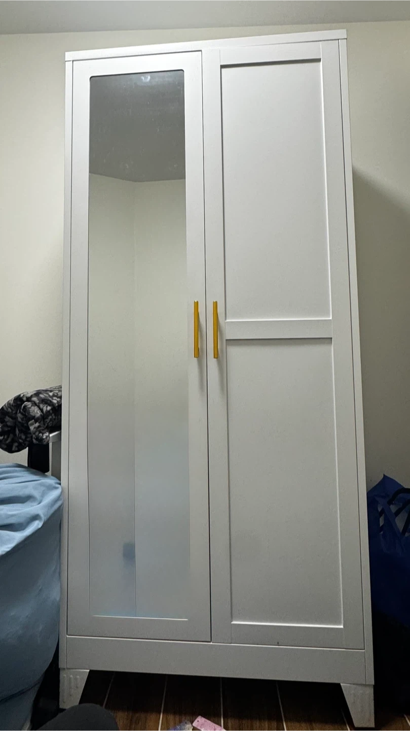 White double door wardrobe with gold handles. It features a mirrored door and a shelf with a hanging rod inside. Great for storing clothes!