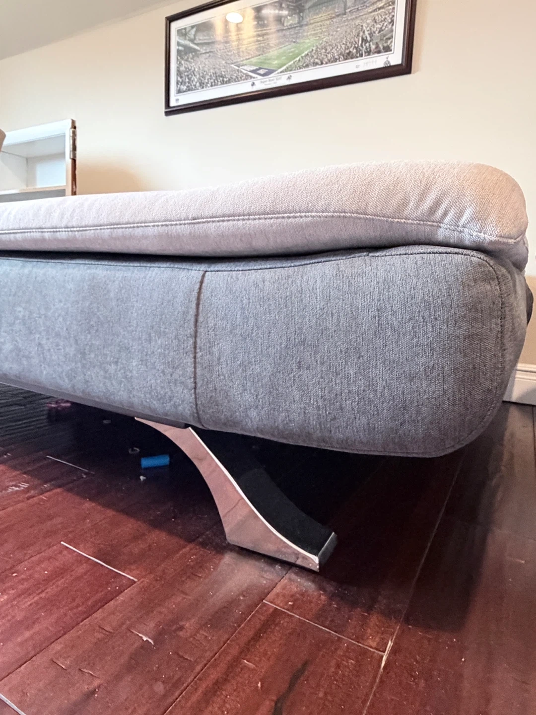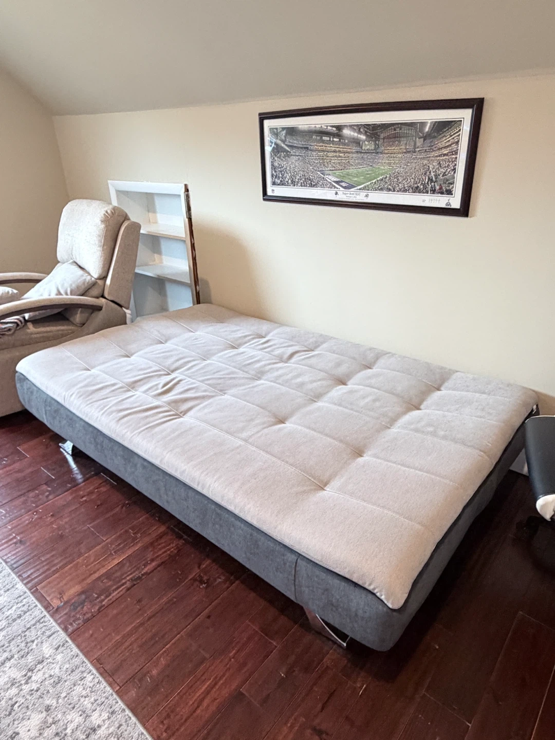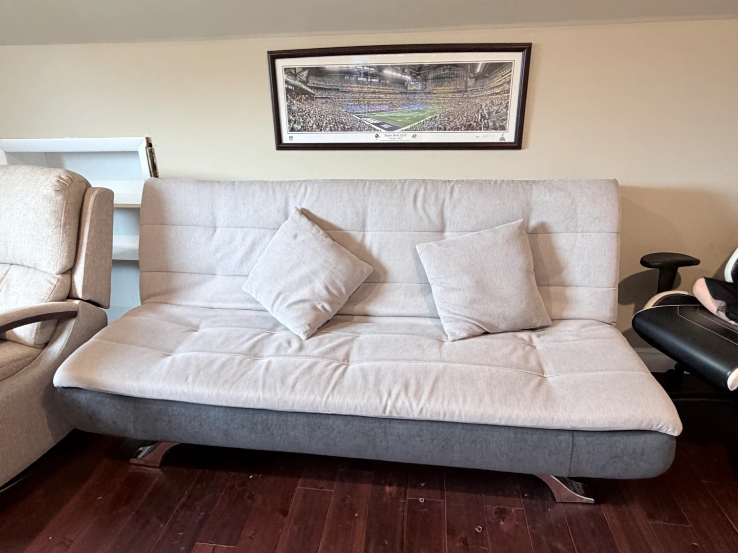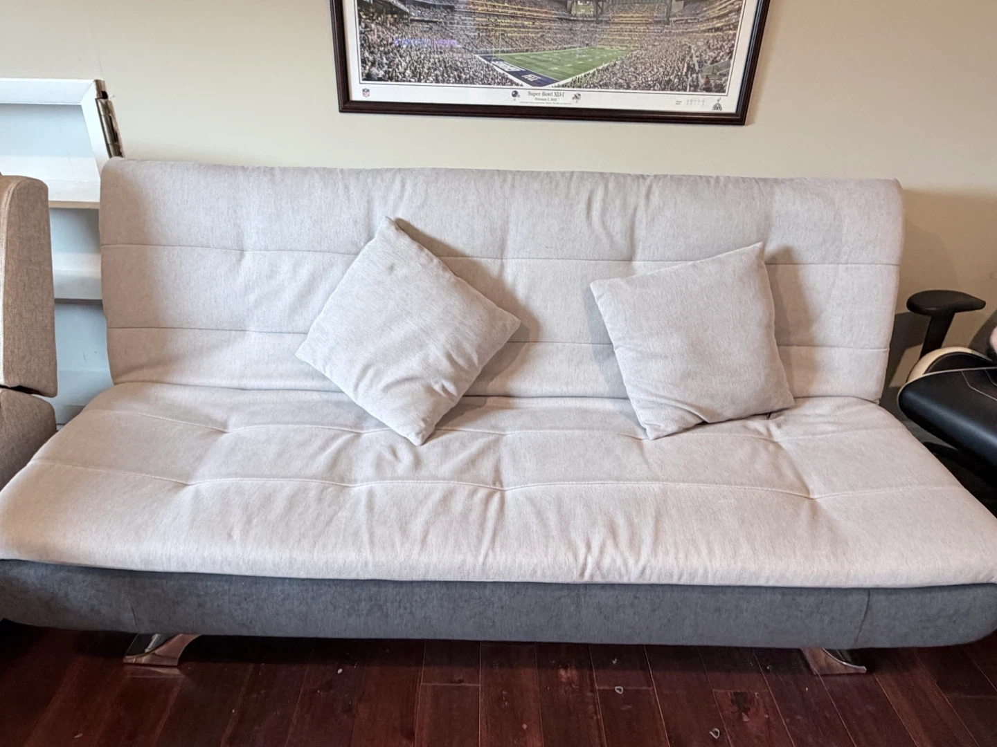 This sofa easily converts into a bed! It includes two matching throw pillows. Upholstered in a light beige fabric with a contrasting dark gray base and modern metal legs.