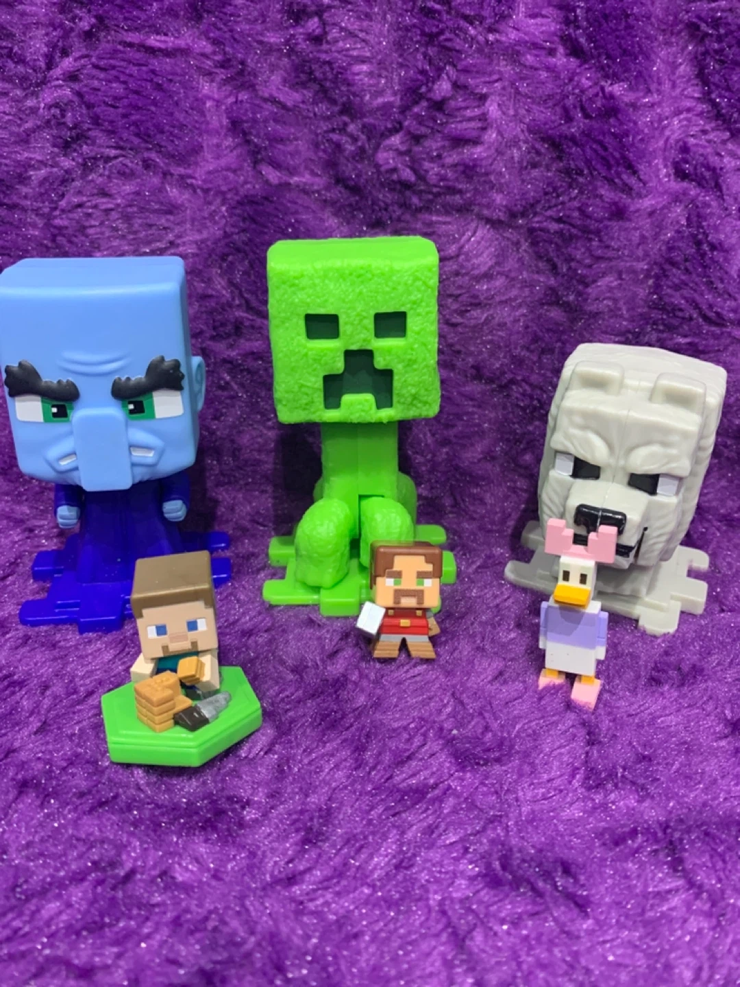 Collection of five Minecraft mini figures including a Creeper, Steve, an Allay, a wolf, and an Iceologer. These are plastic figures, perfect for any Minecraft fan's display or play.