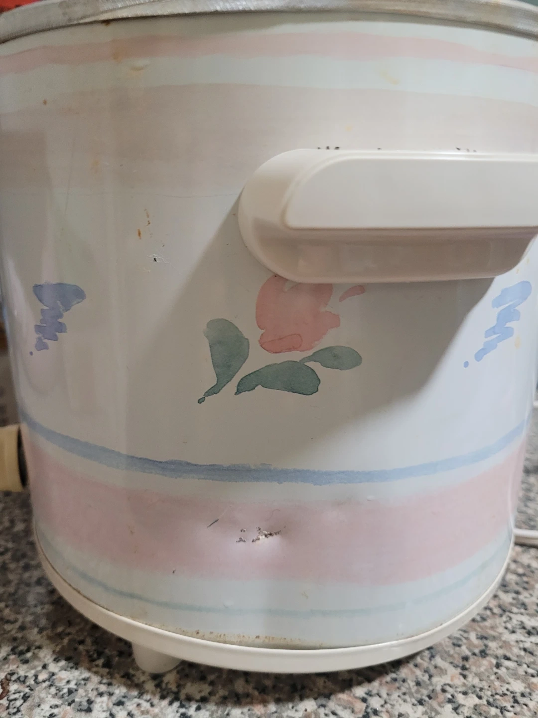 This is a Rival Crock-Pot stoneware slow cooker with a floral design. It has a glass lid and three heat settings: Off, Low, and High. The inner stoneware insert is removable for easy cleaning. It's a classic addition to any kitchen!