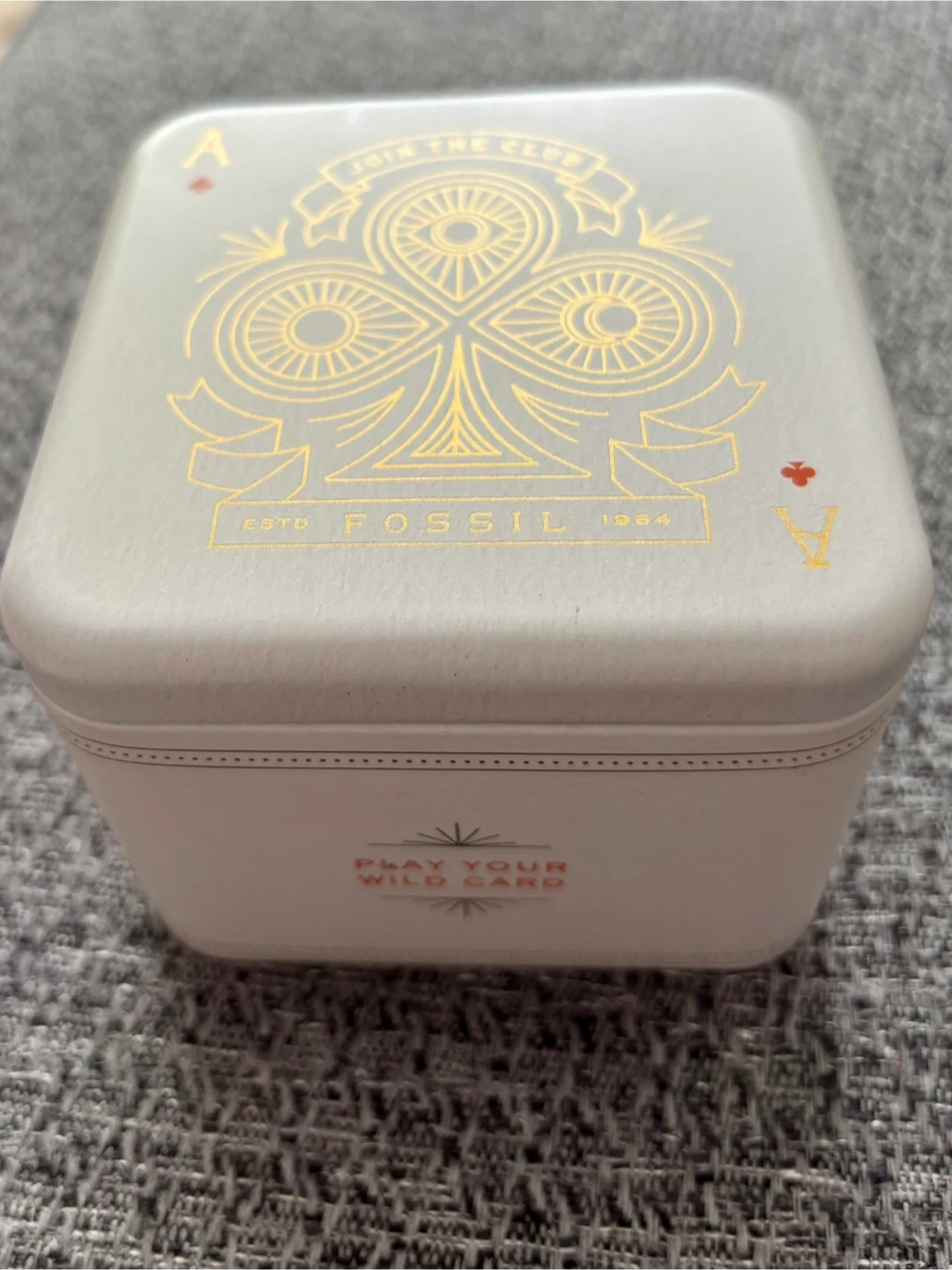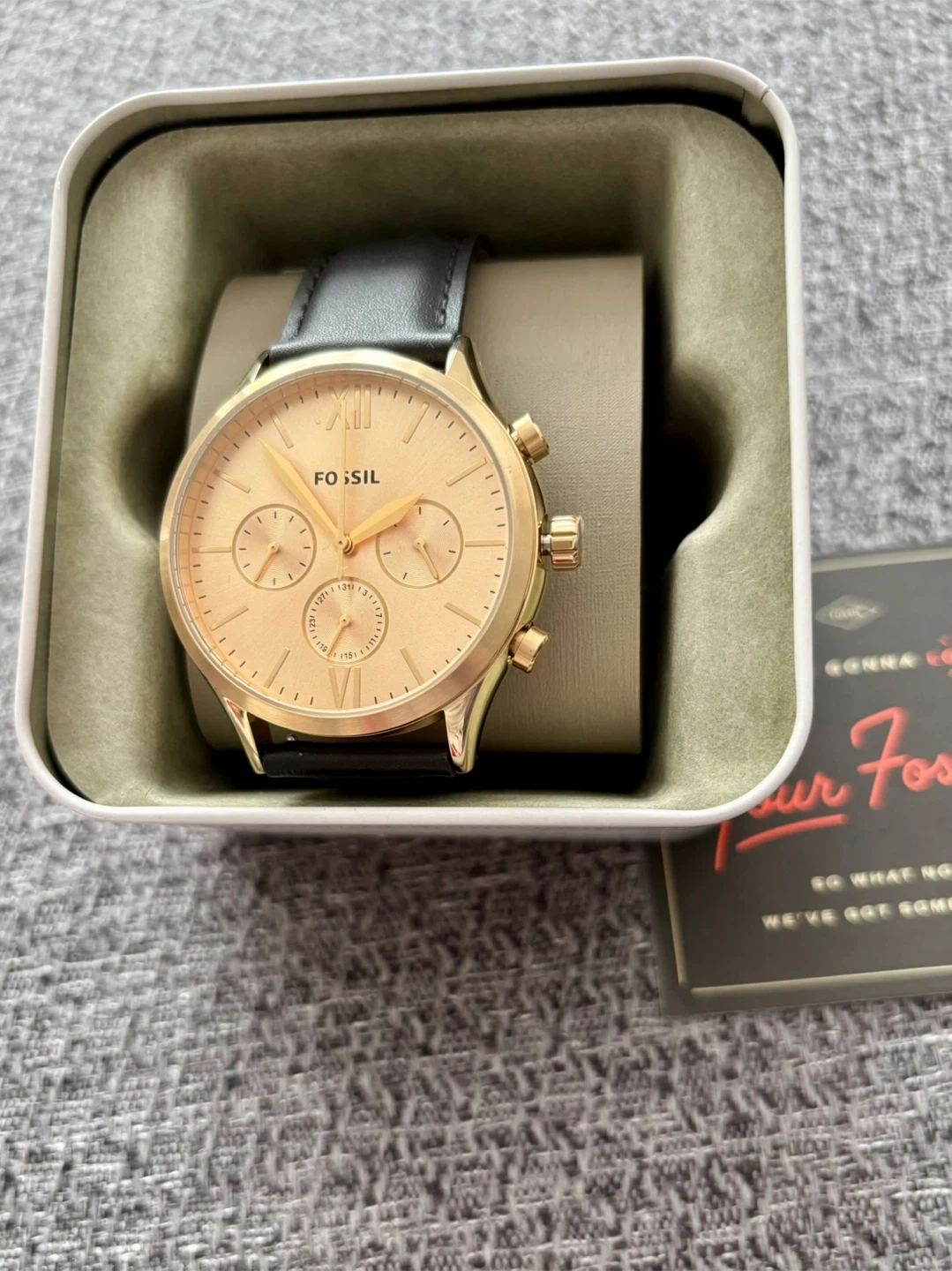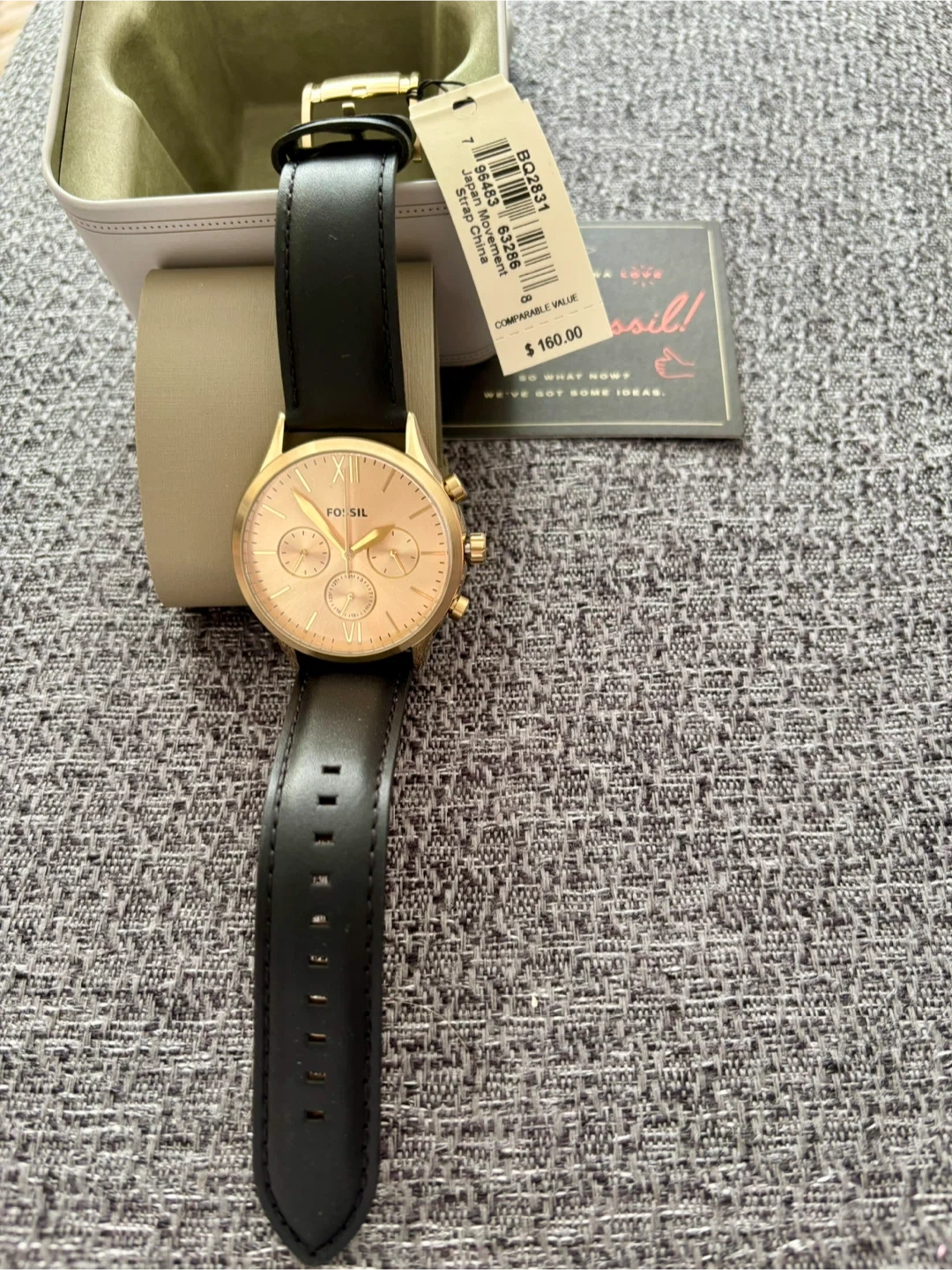 This Fossil watch features a rose gold chronograph dial with a black leather strap. It comes in its original tin box, perfect for gifting or keeping it safe. It's a stylish accessory for any occasion!