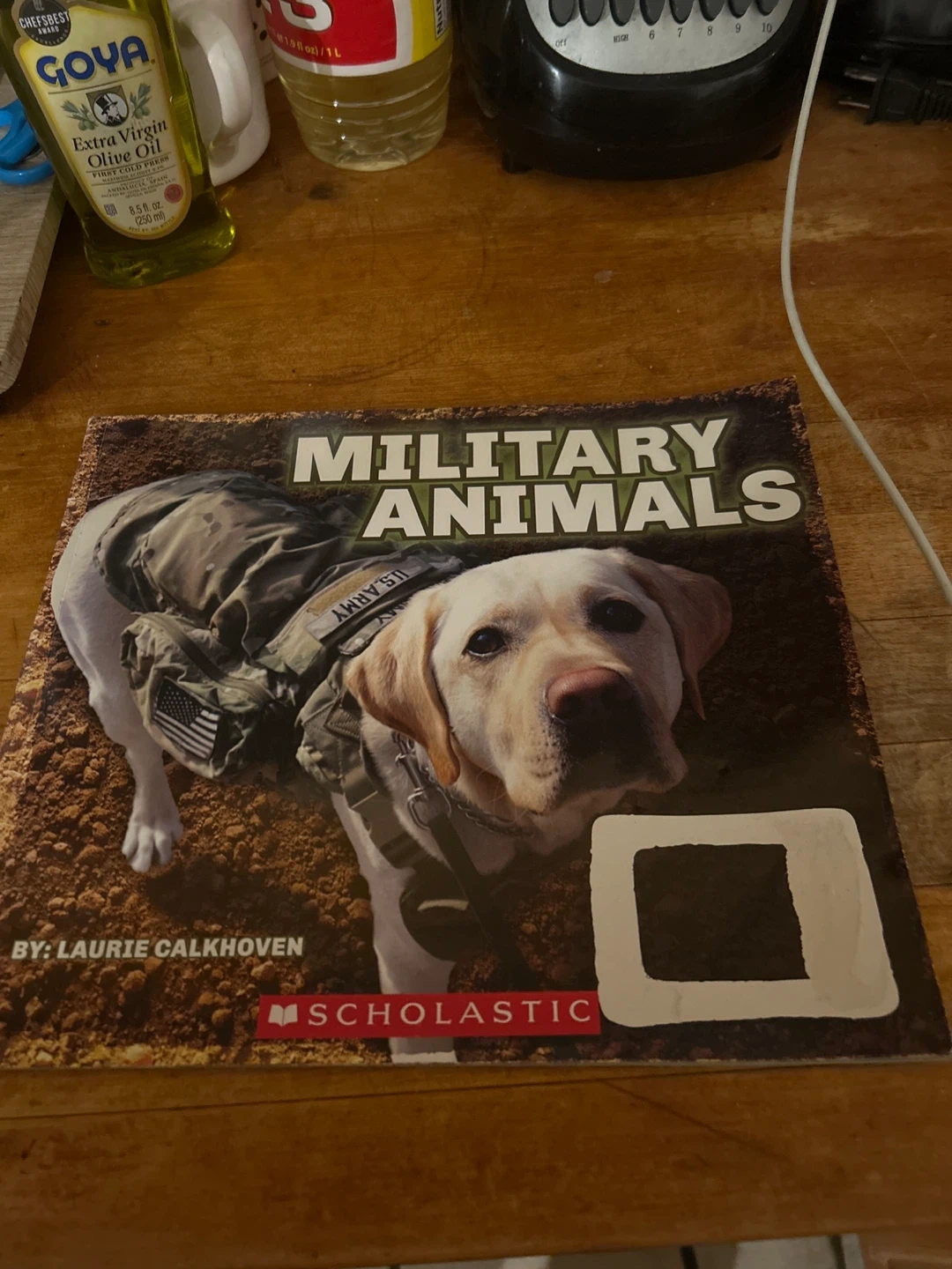 This is the book Military Animals, written by Laurie Calkhoven. It's published by Scholastic. It features images of dogs serving in the US Army.