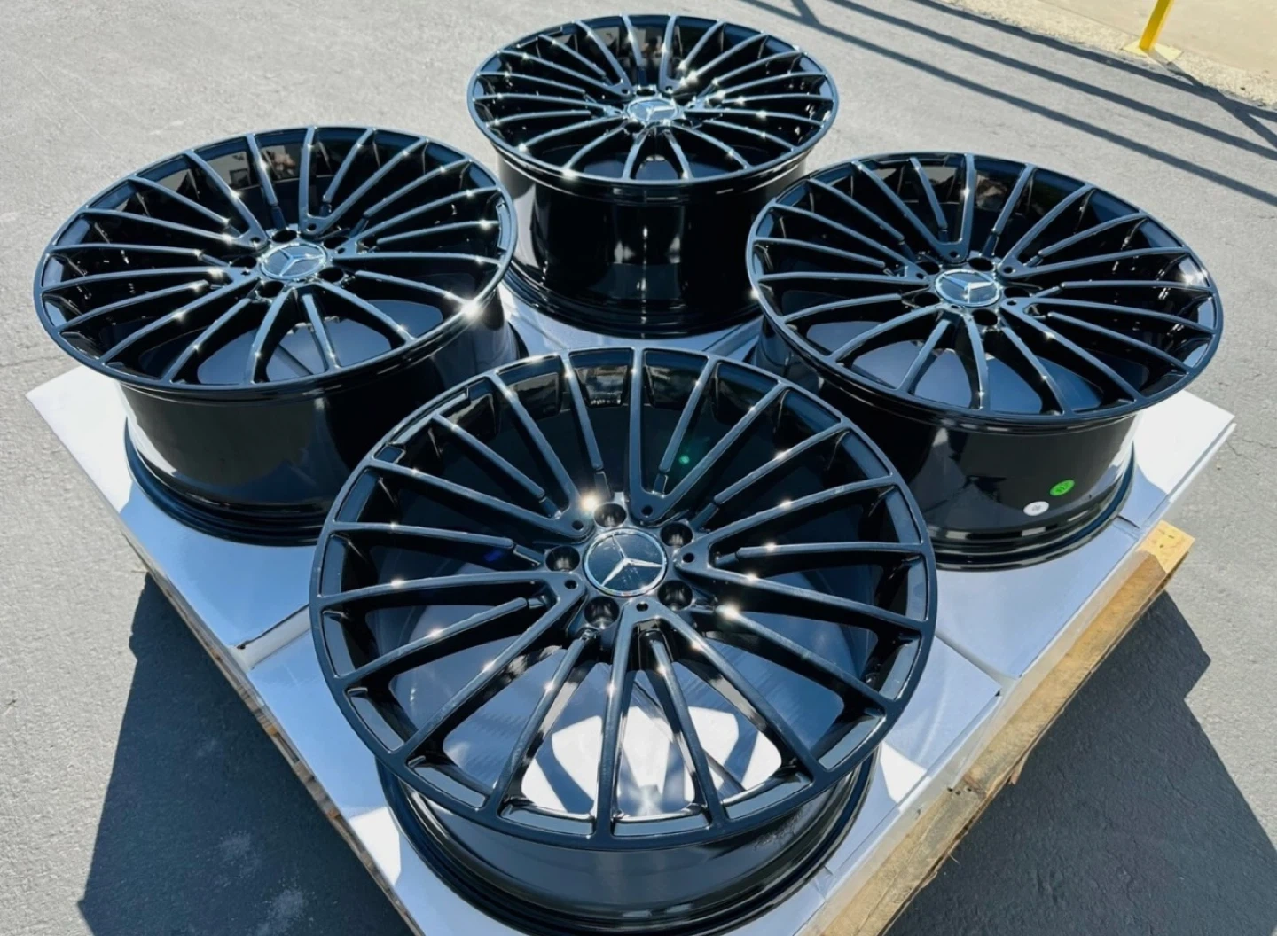 Set of four gloss black Mercedes-Benz wheels. These are alloy wheels with a multi-spoke design. They're finished in a high-gloss black. Check compatibility with your specific vehicle model.