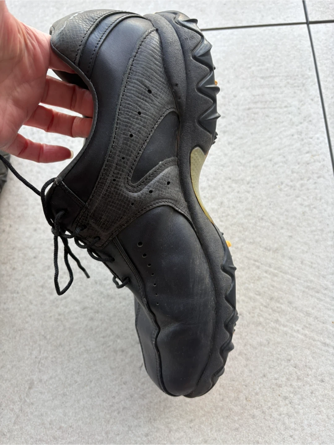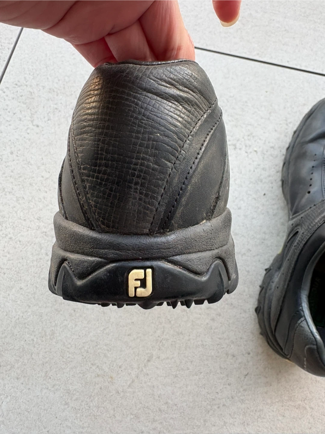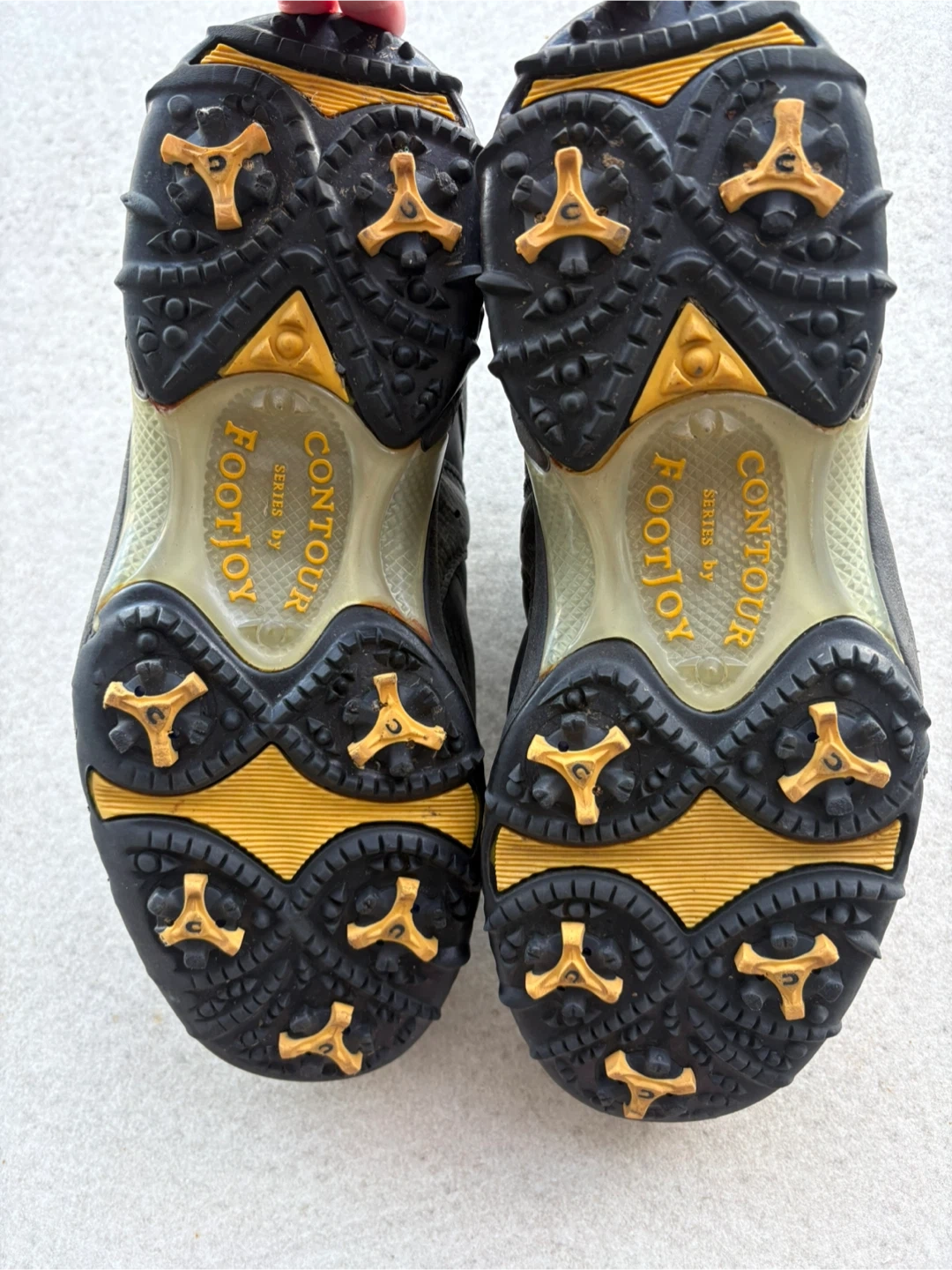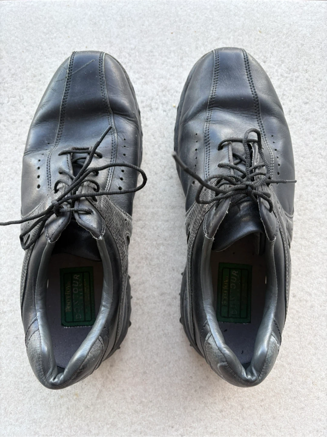Black leather golf shoes with a lace-up closure. These shoes feature a durable sole with cleats for traction. They come with a black Nike shoe bag.