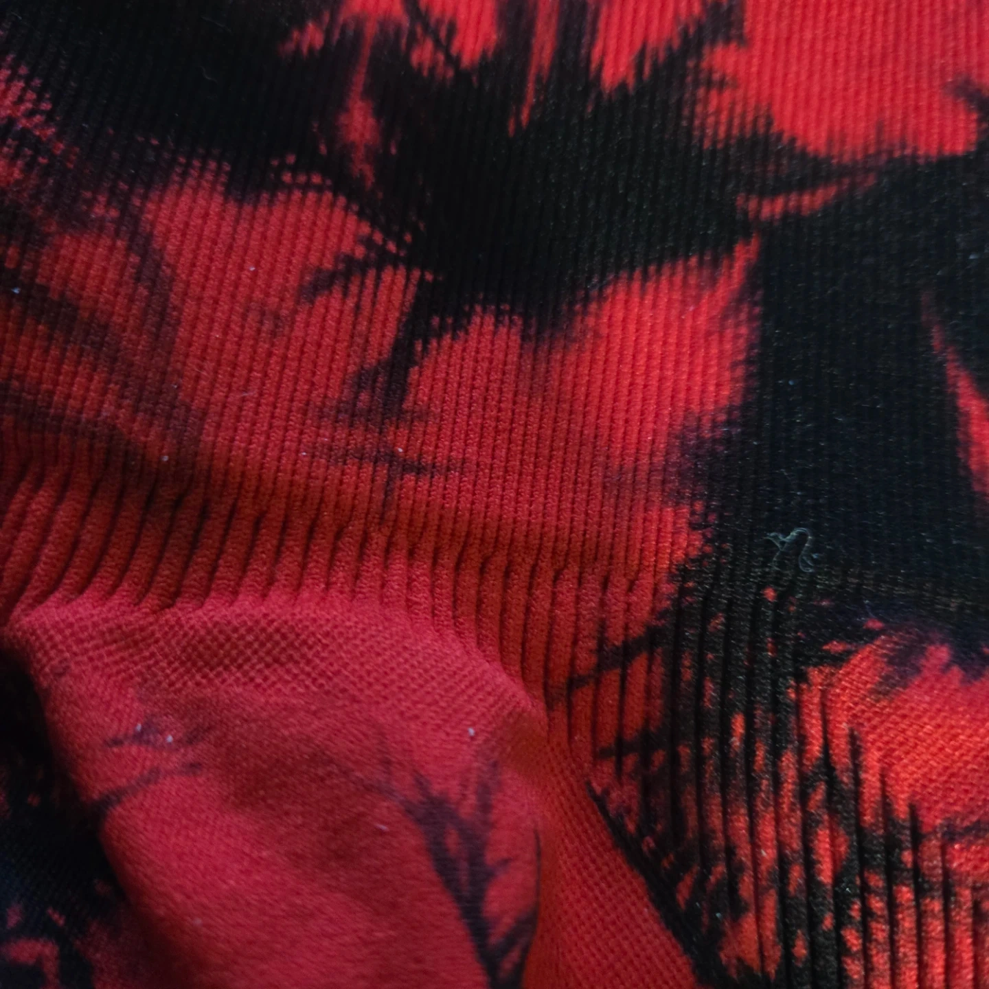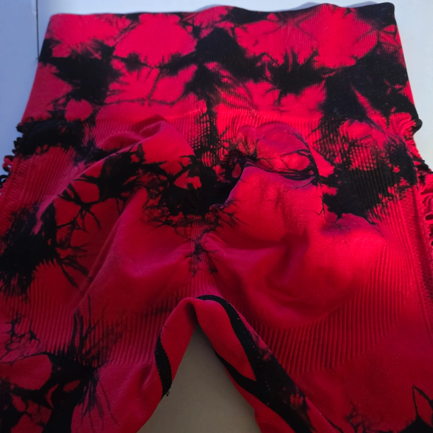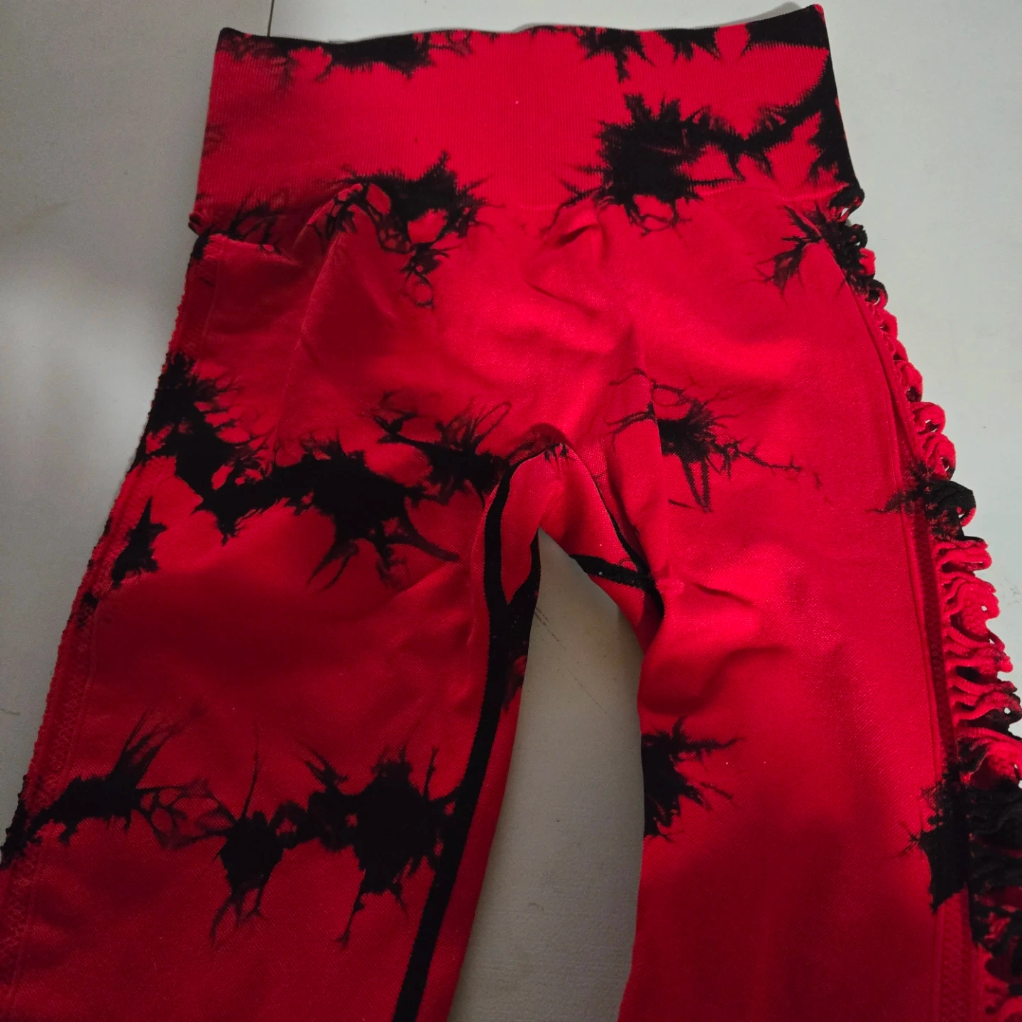 These leggings feature a vibrant red and black tie-dye pattern. They have a high-waisted fit and textured side detailing. Made from a stretchy, seamless fabric.