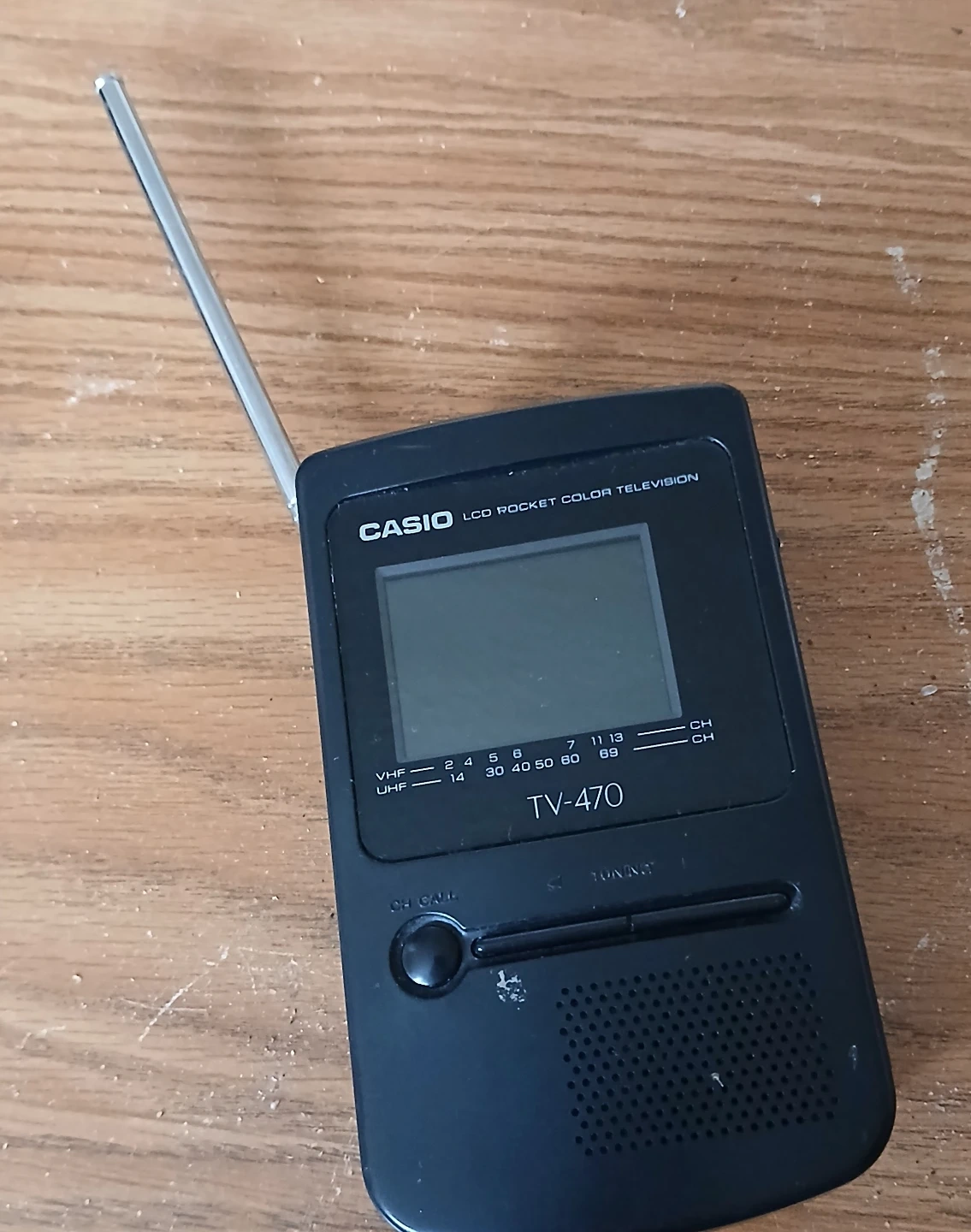 This is a Casio TV-470 pocket color television. It's a portable device with an extendable antenna. The screen is LCD.Tv works but can't get a signal would probably need a digital analog box