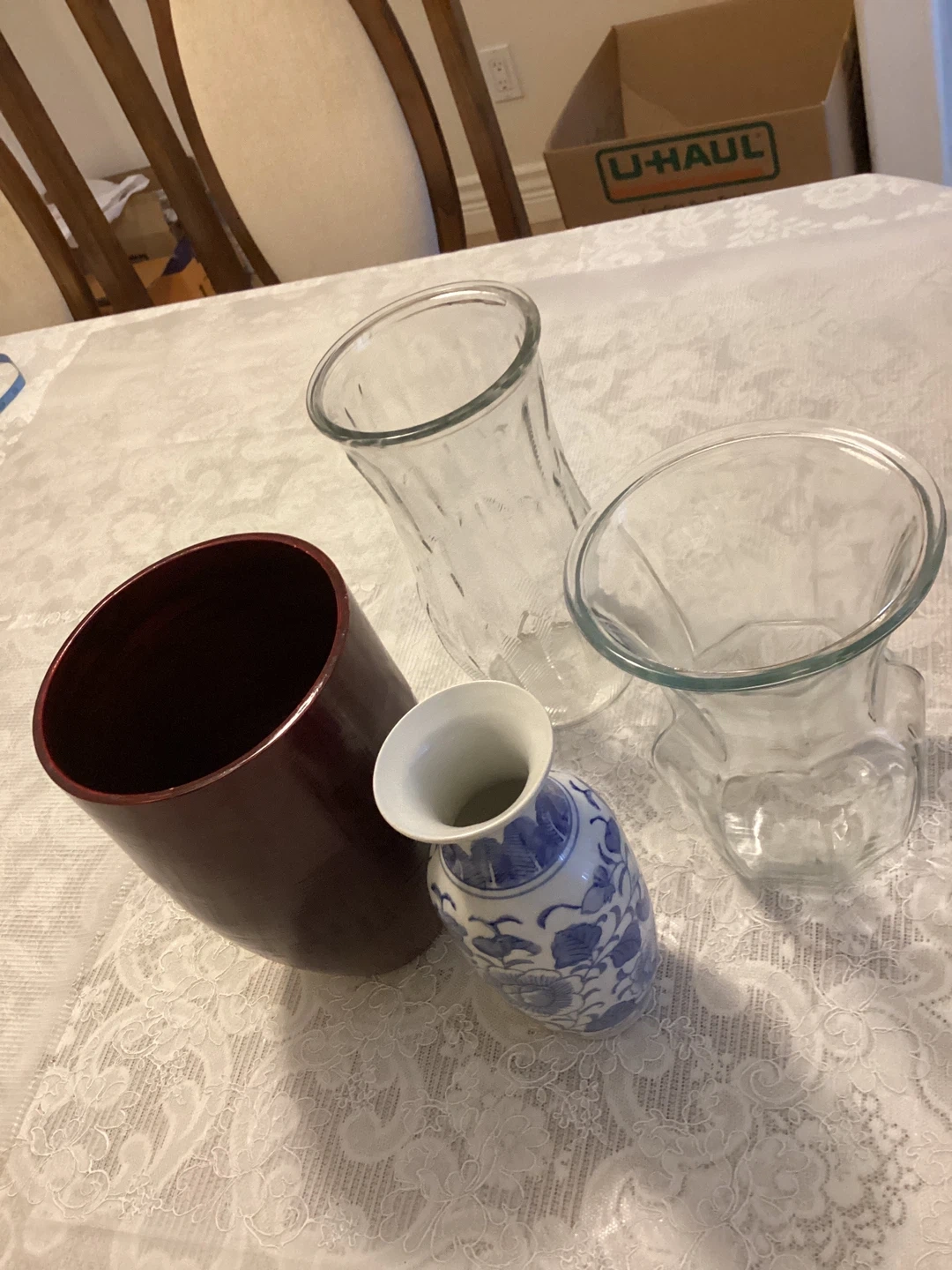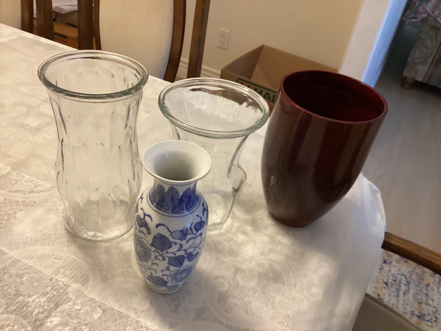 Selling a collection of assorted vases! There are four vases in total. One is a dark red wooden vase, two are clear glass, and the last is a small blue and white ceramic vase. Red wooden vase is brand new