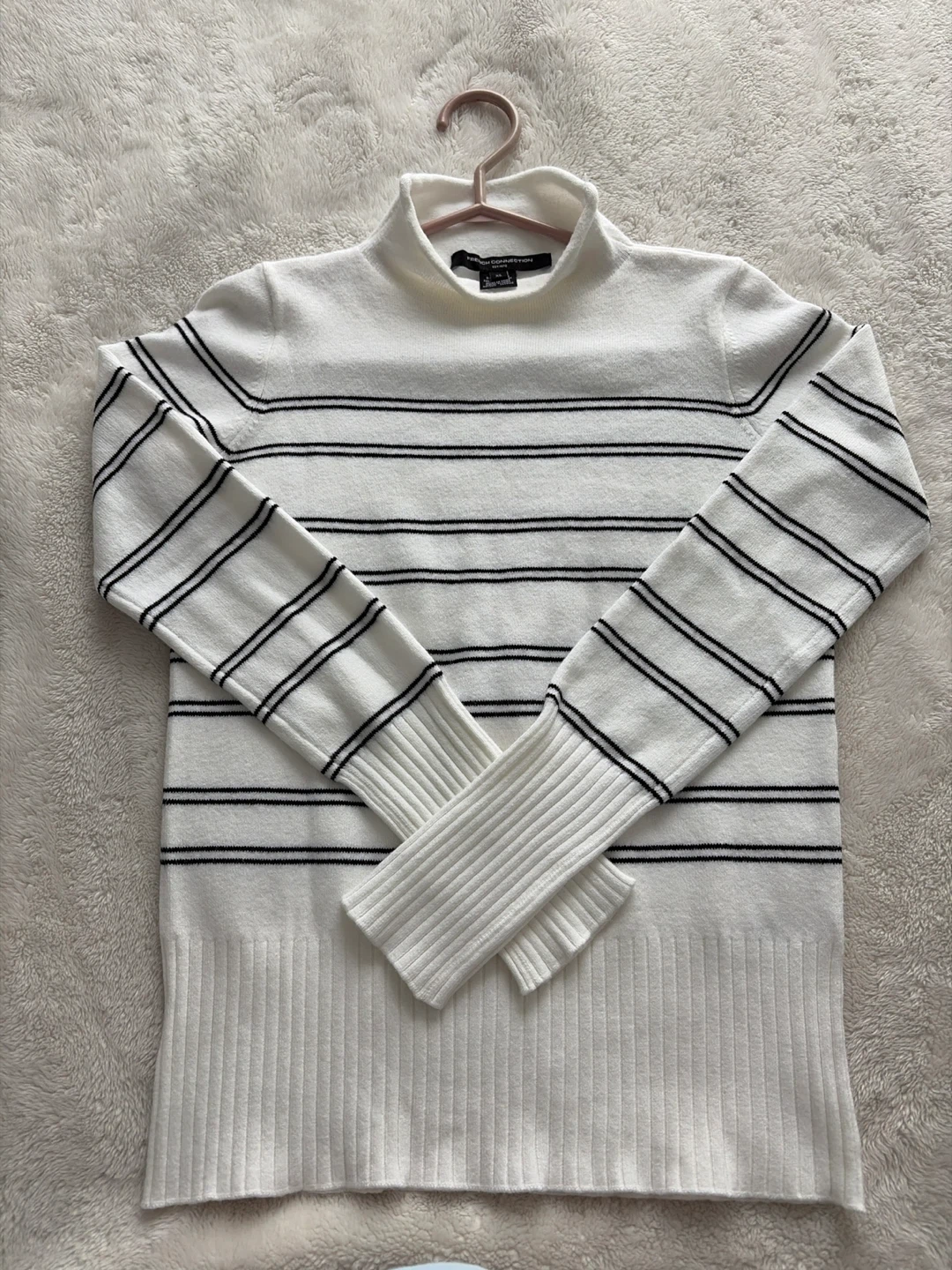 Selling a French Connection sweater in excellent condition! It's a size XS and features a stylish white base with black stripes. Perfect for layering or wearing on its own. The material is soft and comfortable, making it a great addition to any wardrobe