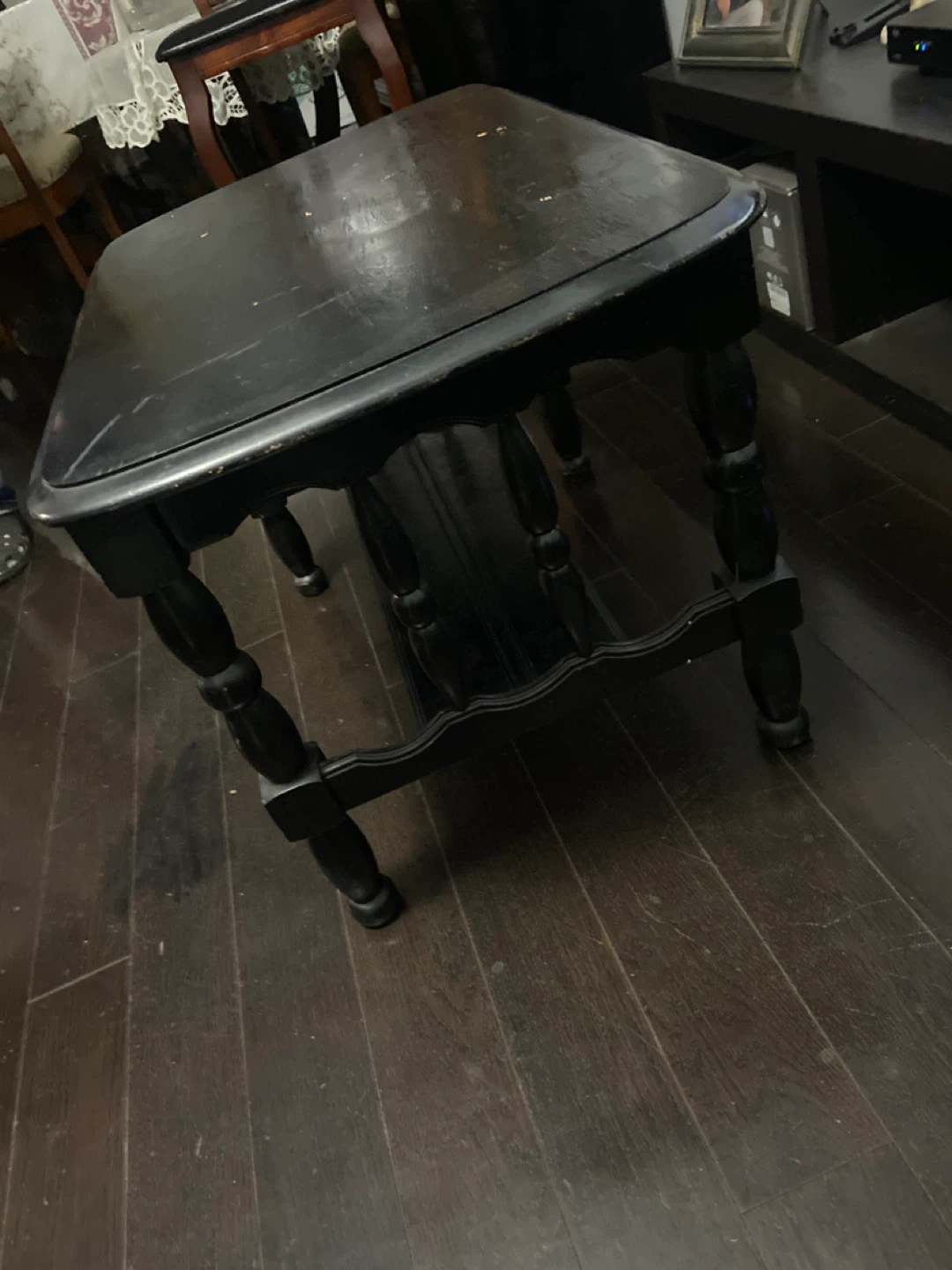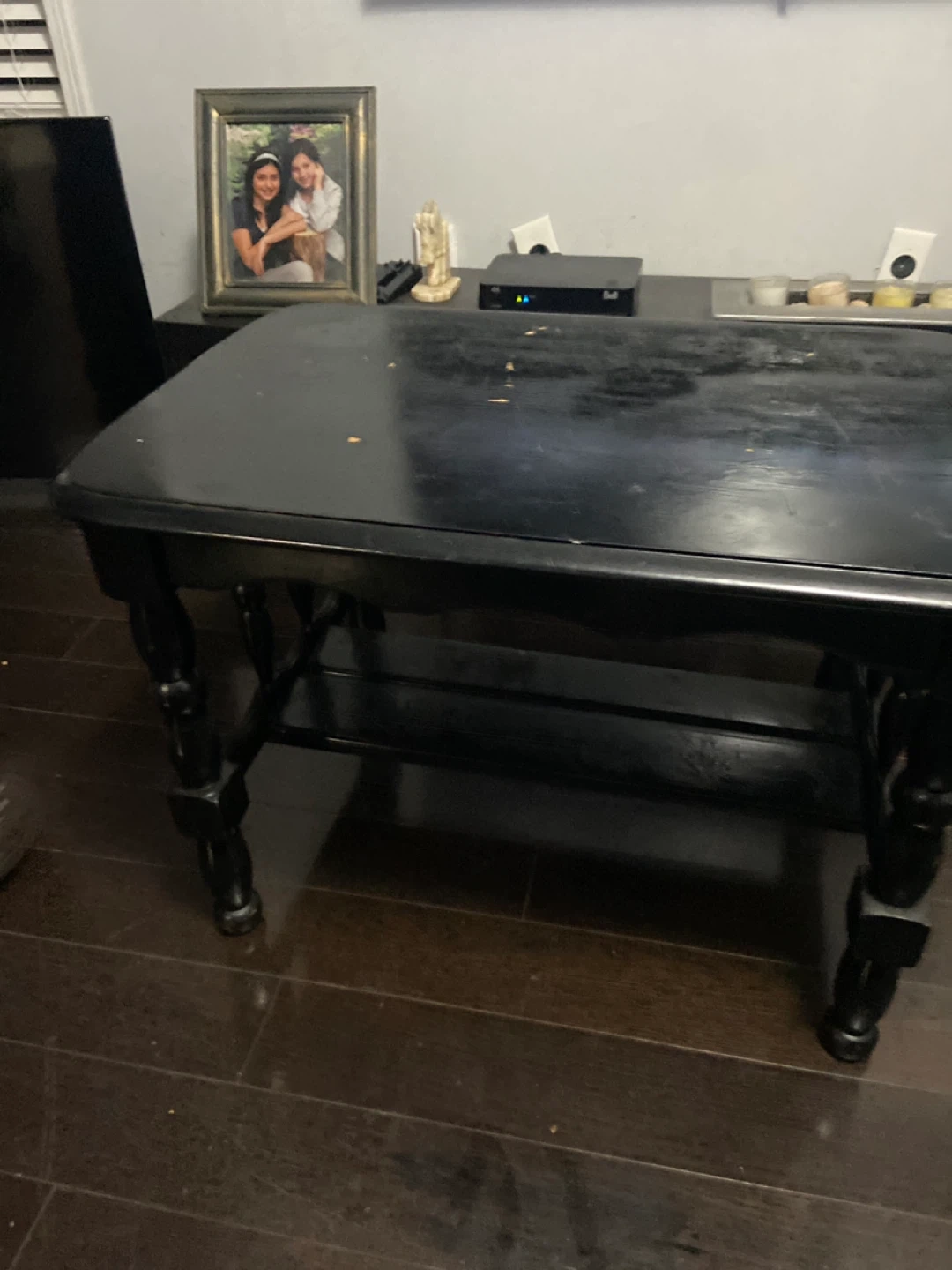 Solid wood , black coffee table. It has some signs of use, as you can see in the pictures,a little bit of paint and will look new .