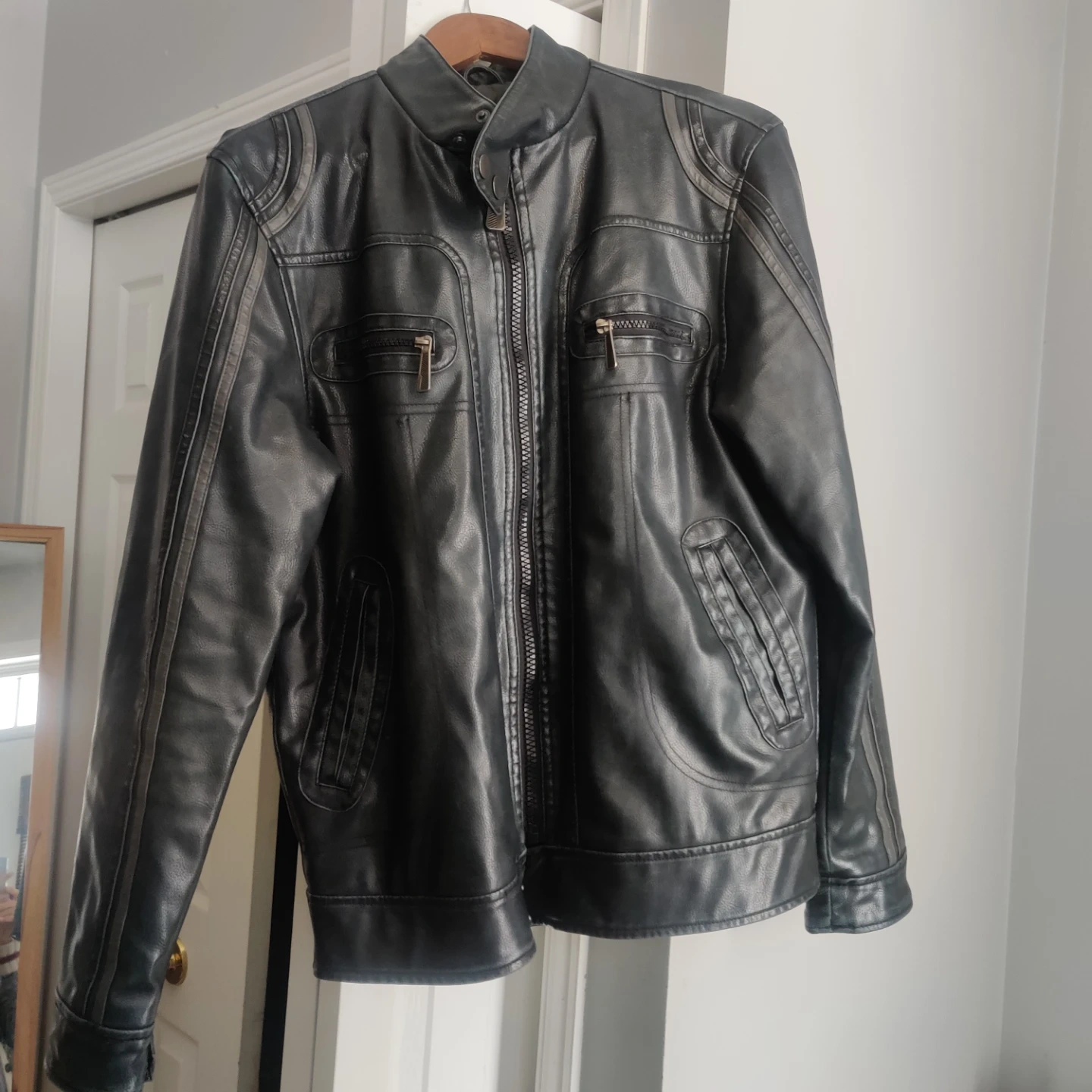 Selling a black leather jacket. It has a zipper closure and some stylish detailing on the shoulders and arms. Perfect for adding a bit of edge to your wardrobe!
