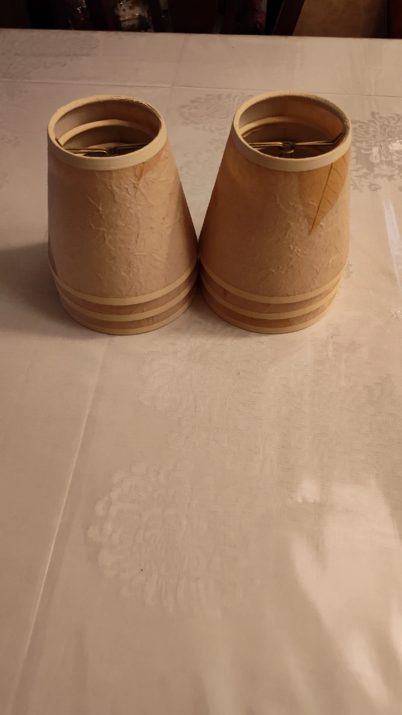 Selling a set of six lamp shades. They have a textured, paper-like finish in a neutral colour, with a leaf design on some of them. Great for adding a warm touch to any room!