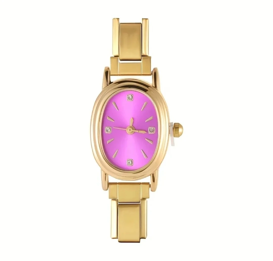 Selling a beautiful gold-tone ladies' watch with a striking pink face. The watch features a classic oval design and is in great condition. It's a stylish accessory that will add a pop of colour to any outfit