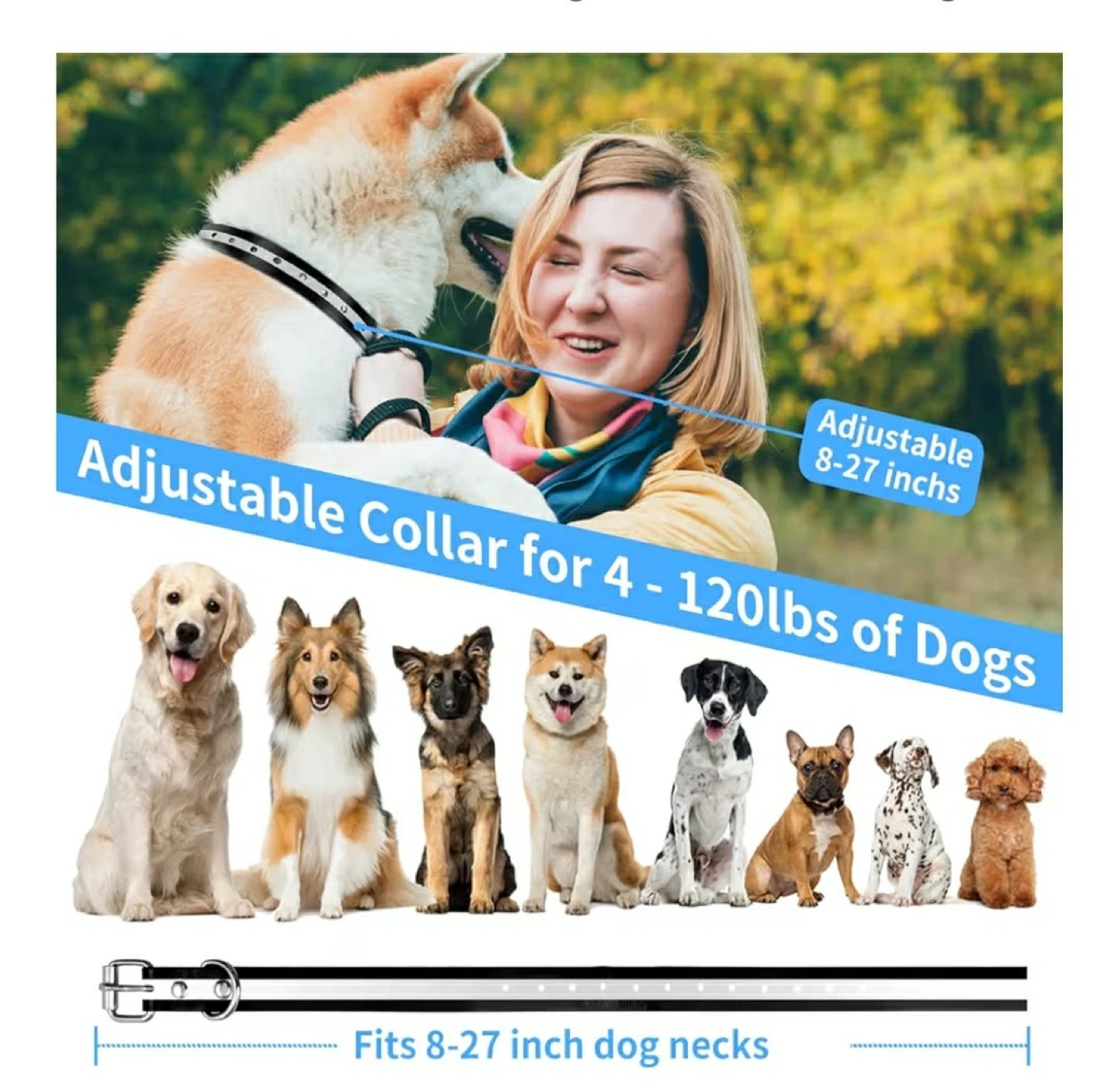 Looking to train your furry friend? This PalPetek dog training collar comes with a remote and is adjustable for dogs weighing 4-120lbs with neck sizes of 8-27 inches. Features include: