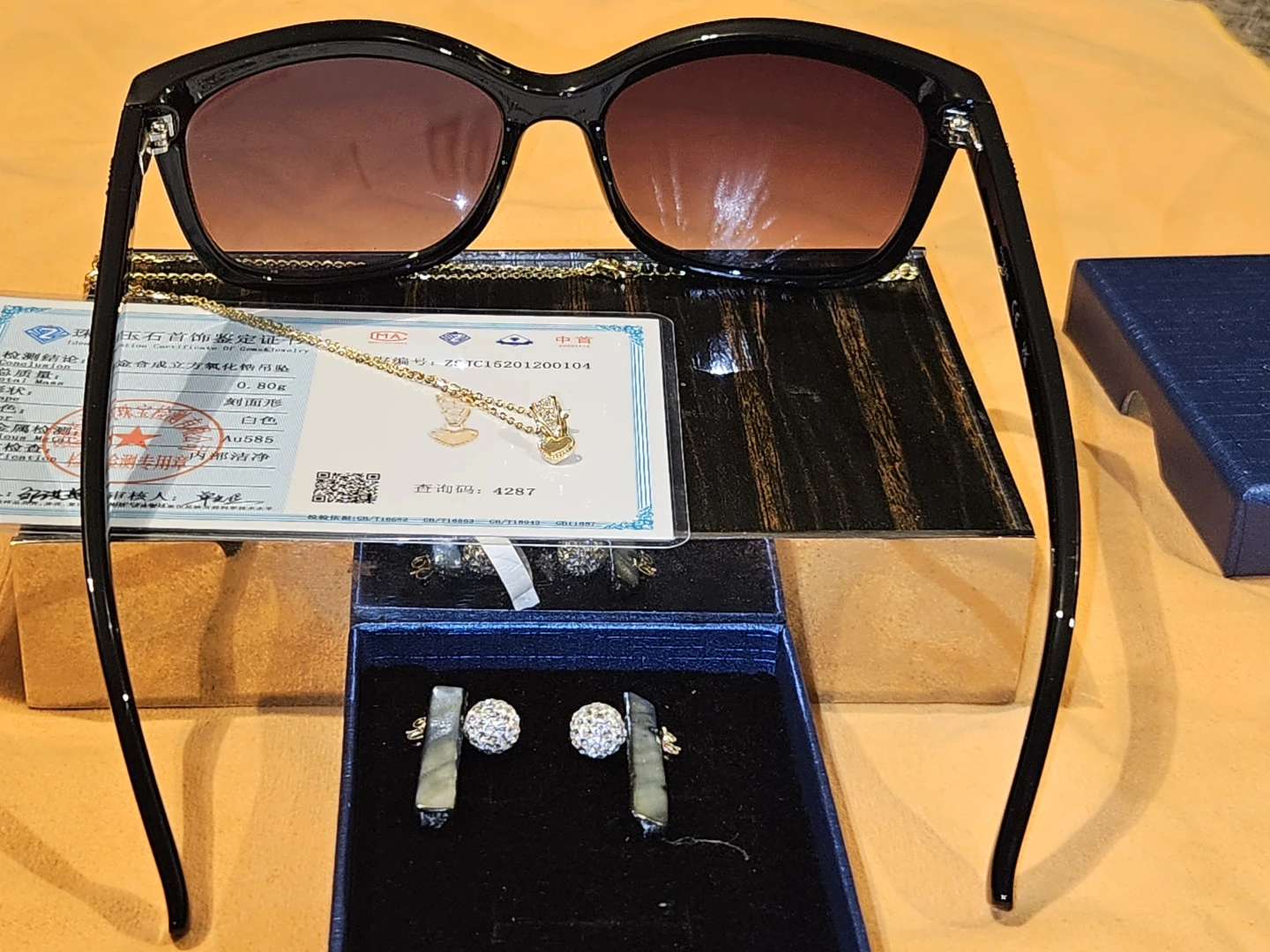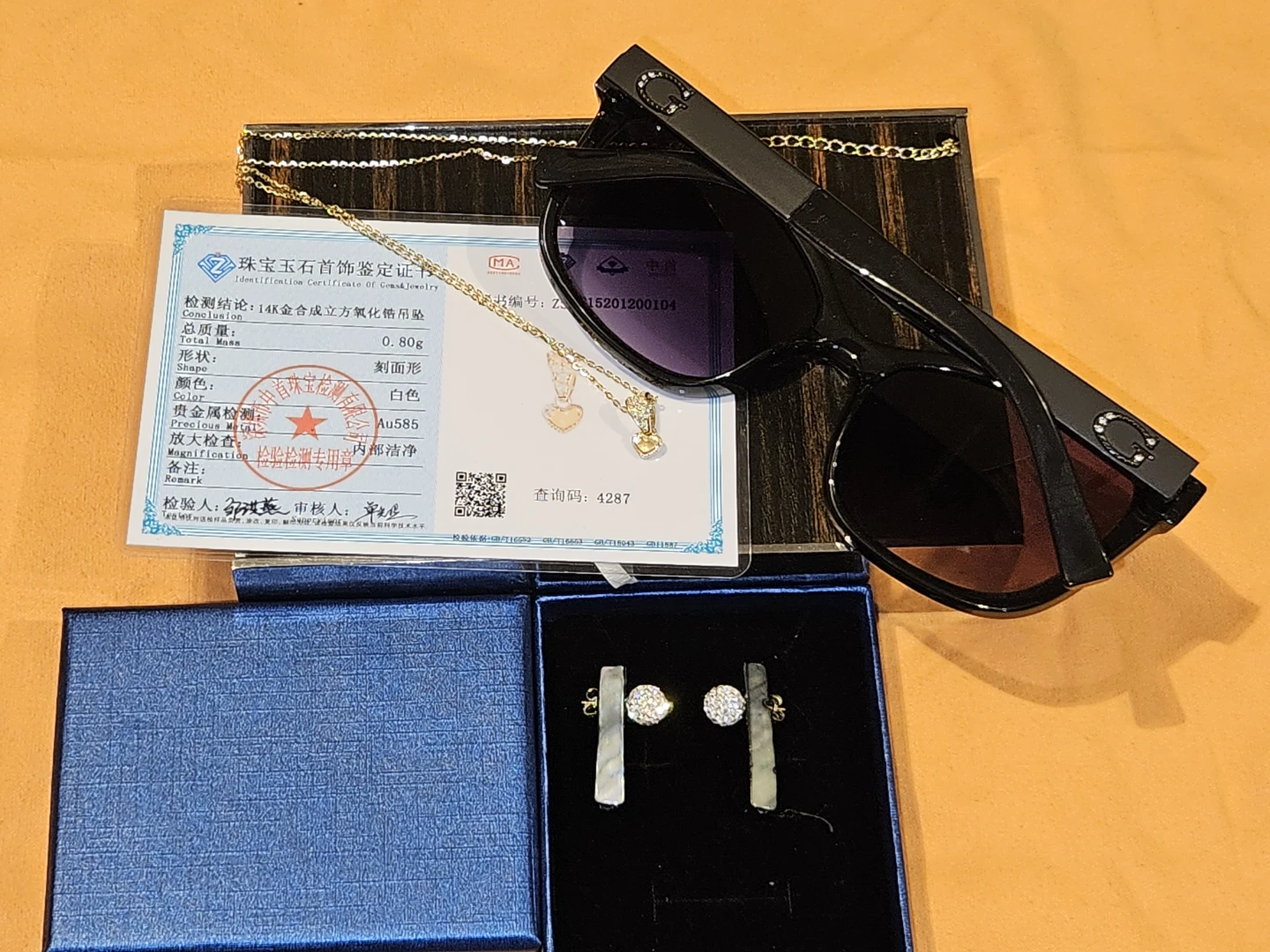 Stylish Gucci sunglasses in black, model GG1785 003. Size 54-18-145 M. A great accessory to complete any look! Plus it comes with a pair of 14k S925 Italian silver necklace chain and a 14k heart pendant with moissanite stones decorative pieces and * an earring 14k yellow gold With sapphire and real sea shells polished * has certificate and jewelry box.