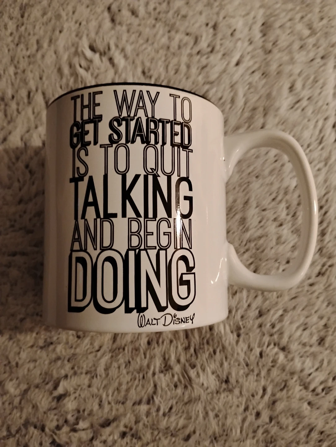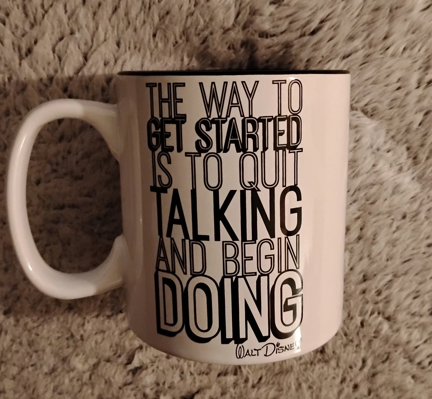 THE WAY TO GET STARTED IS TO QUIT TALKING AND BEGIN DOING written on both sides of the mug.