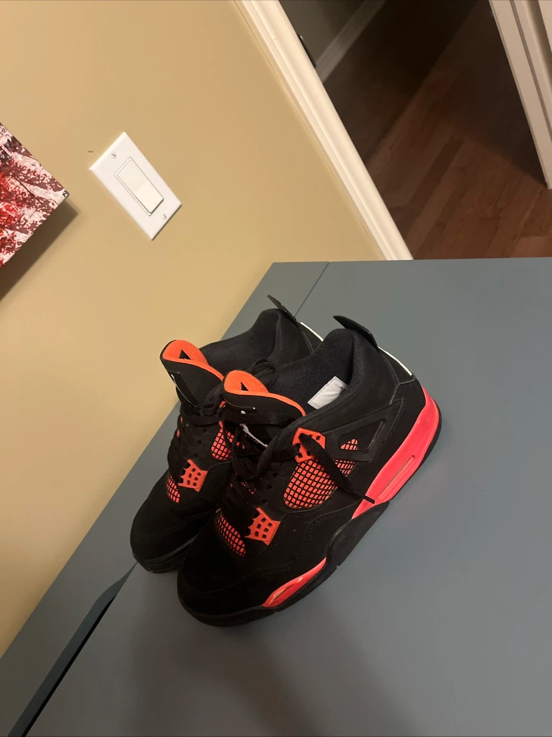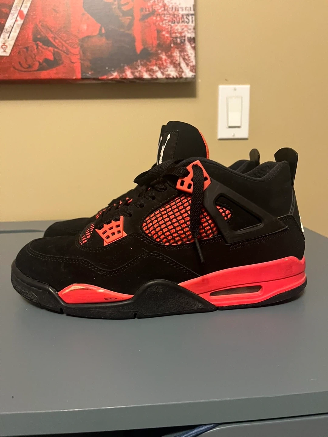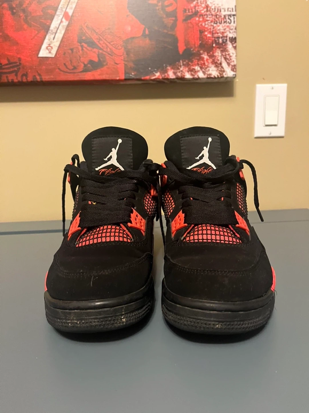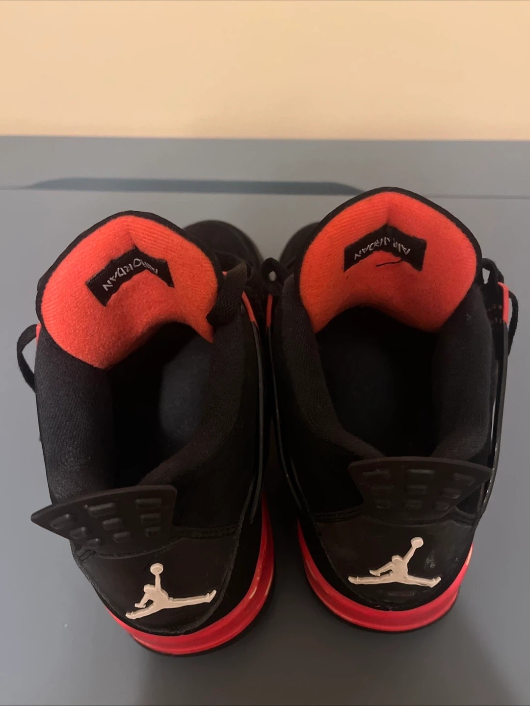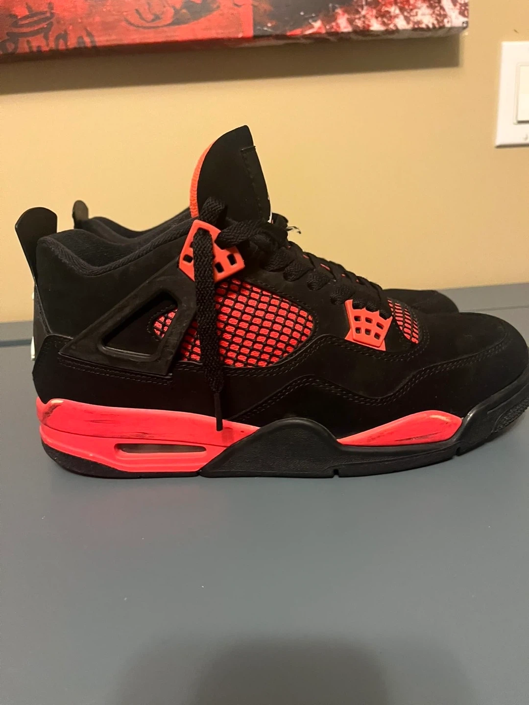 Selling a pair of Air Jordan 4 Retro sneakers in black and crimson. They're in good condition and ready for a new owner!