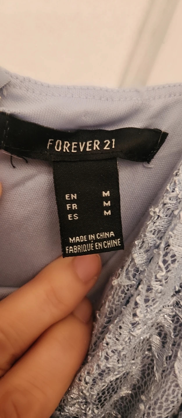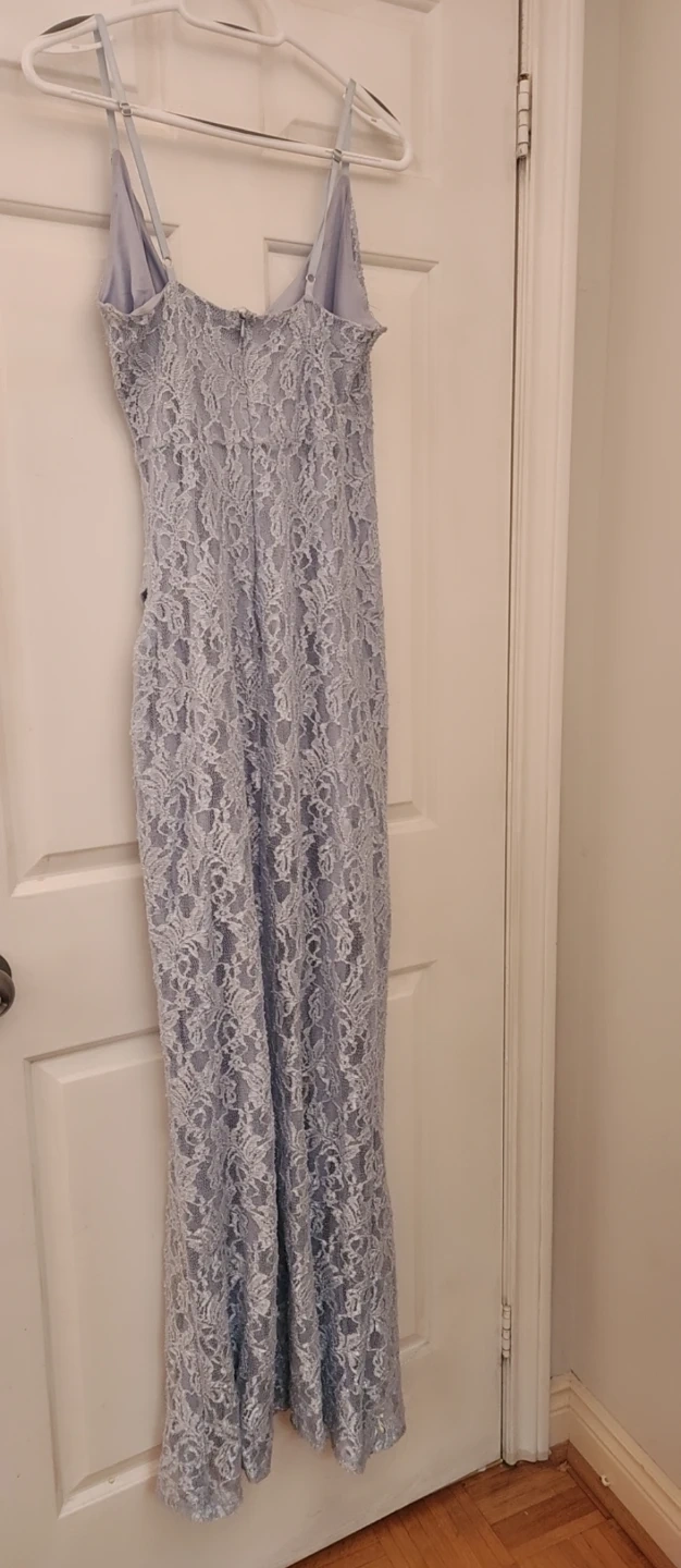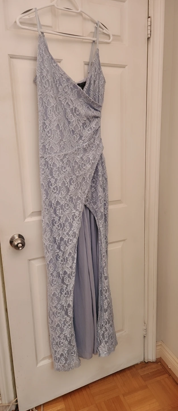 Selling a lovely Forever 21 lace dress in size M! It's a beautiful light blue colour and features a stylish slit. Perfect for a special occasion or a night out