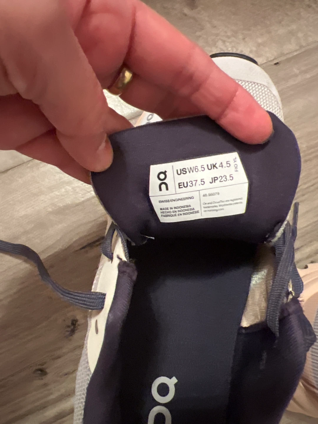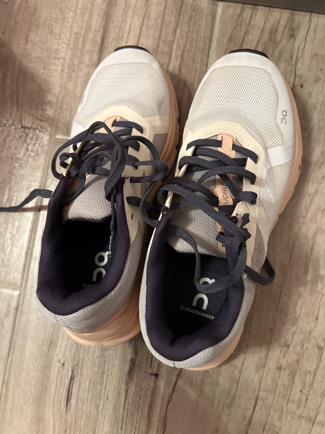 Selling a pair of On Cloudrunner women's running shoes in size US 6.5. They are in great condition and ready for your next run! The shoes feature Swiss engineering for a comfortable and supportive fit