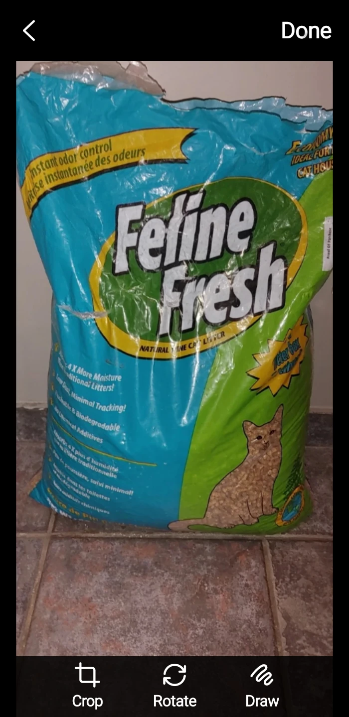 Selling a bag of Feline Fresh Natural Pine Cat Litter. It was 40 lbs (18.14 kg) but one litter box worth was taken out to try it. This litter offers instant odor control and is low tracking. It is also biodegradable and free of chemical additives.