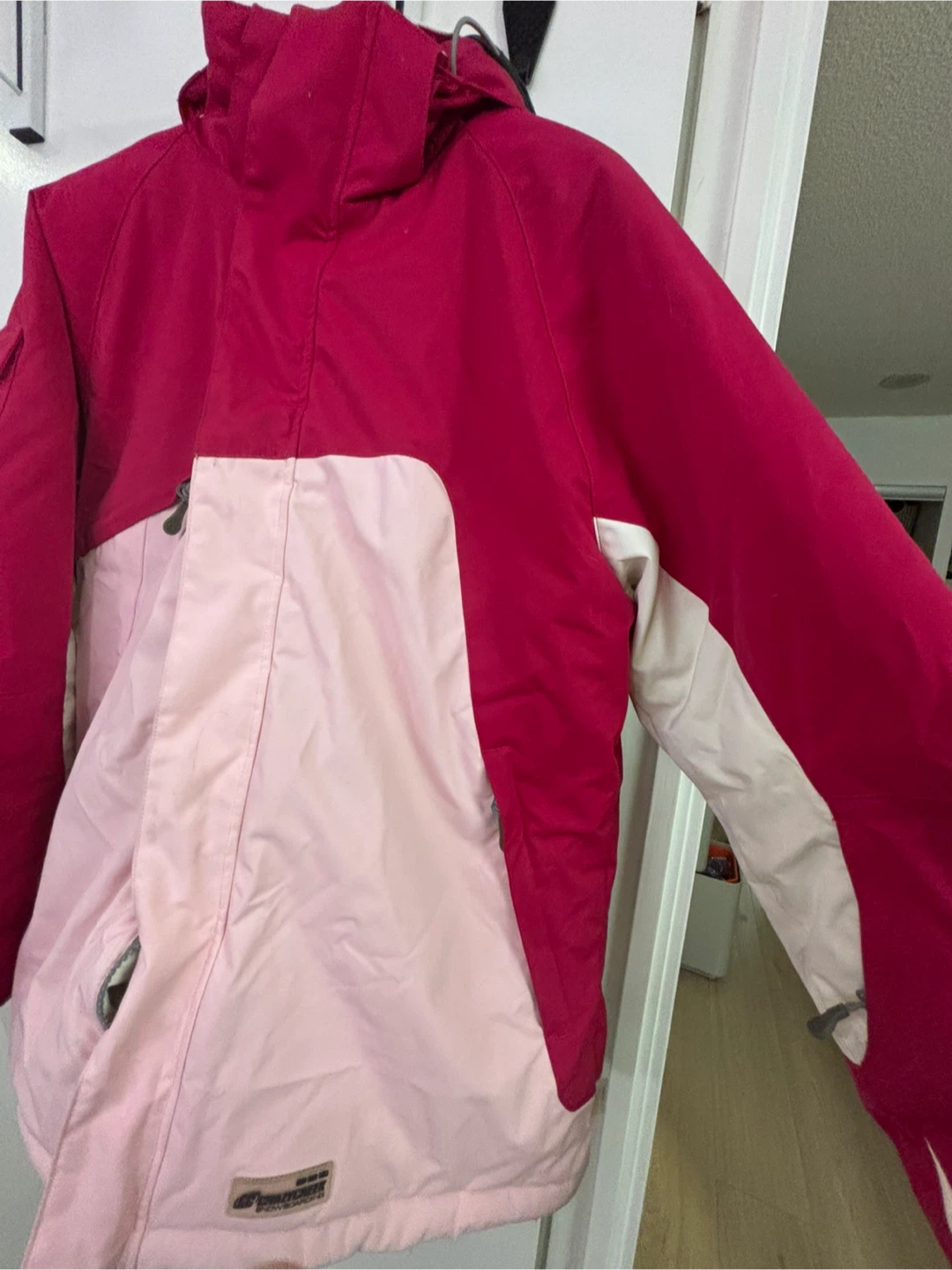 Crazy Creek winter jacket in size youth XL! It features a cool pink and red colour block design, and the bottom has a cute butterfly design. It is good for beginner ski or snowboard women’s small. Very warm and nice condition