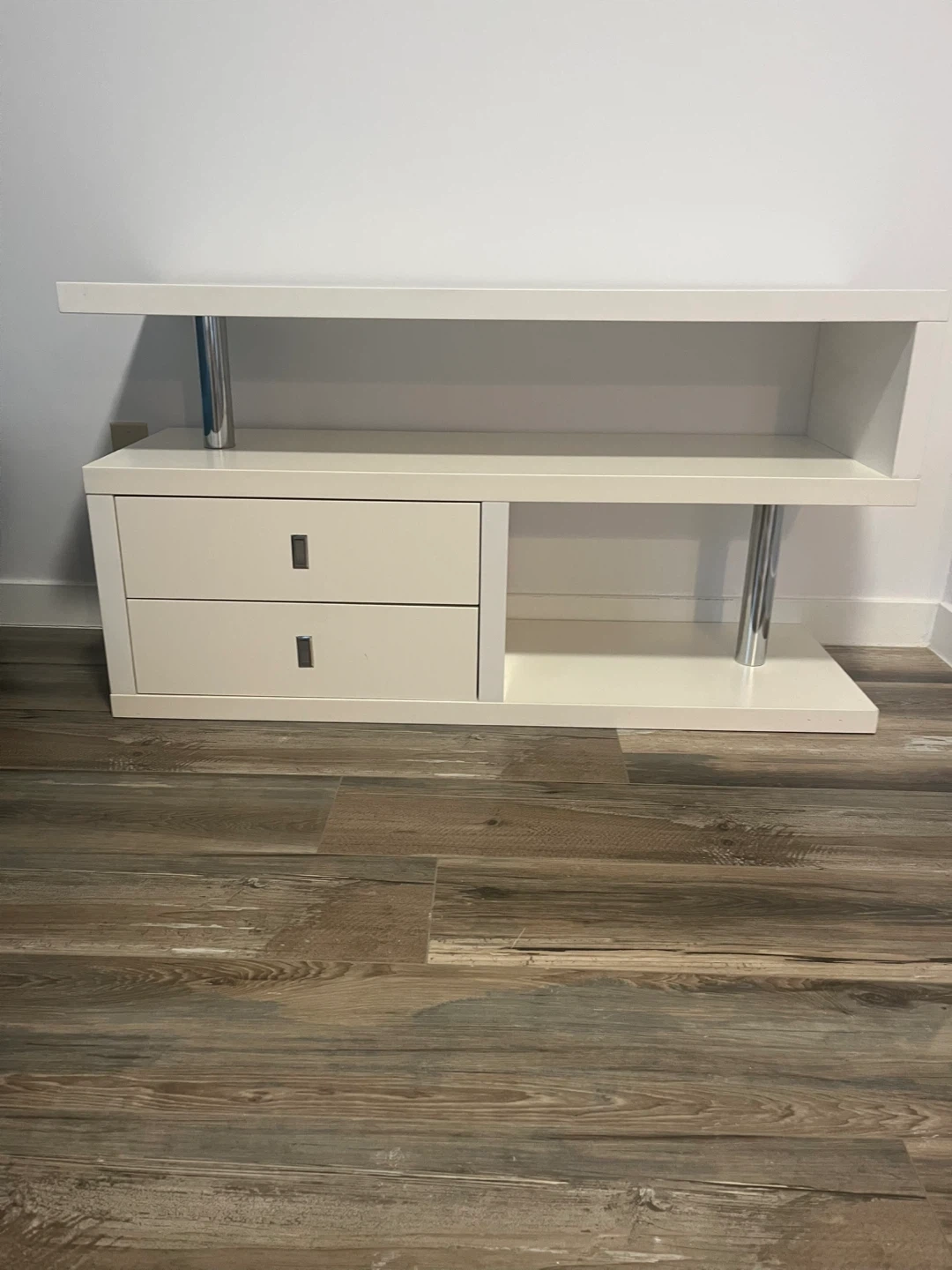 Selling a modern white TV stand that will look great in any living room! It features two drawers for storage and a sleek design with chrome-finished legs. Perfect for keeping your entertainment area organized and stylish