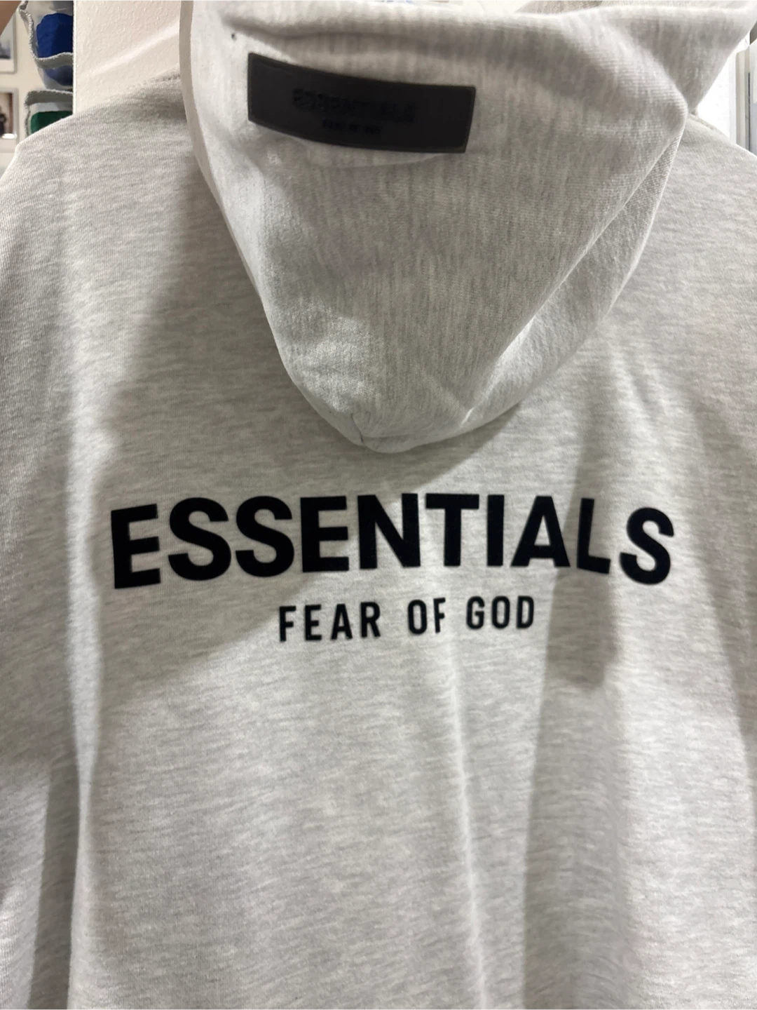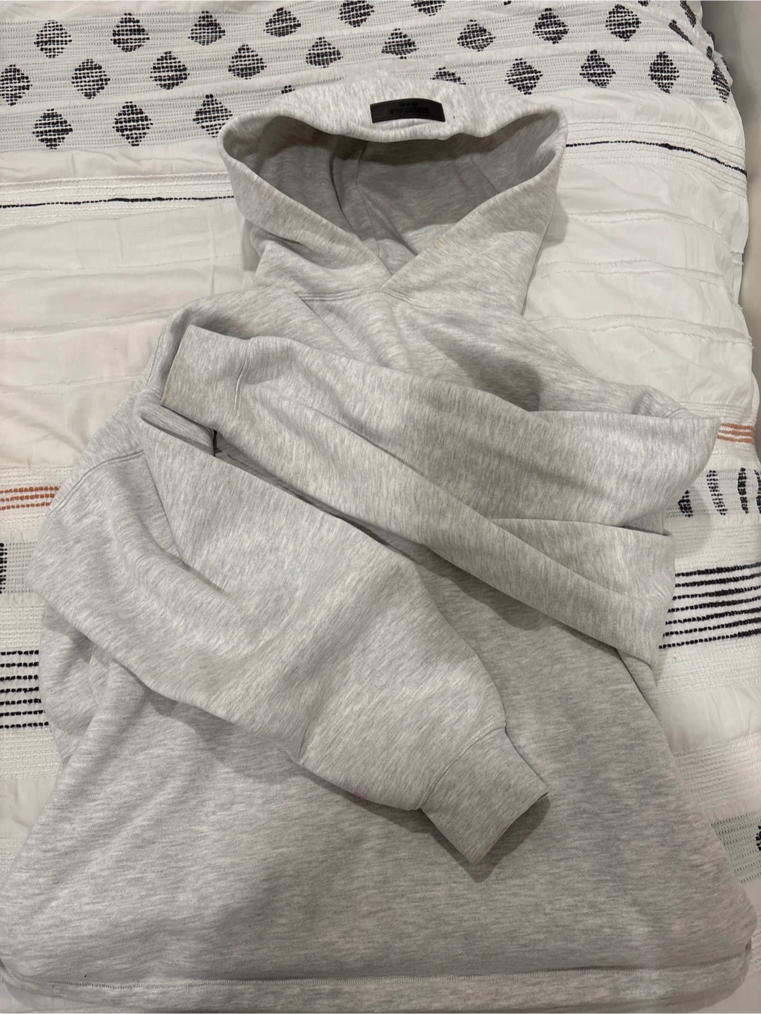 Selling an Essentials Fear of God hoodie. It's in great condition.The hoodie is a light grey colour with the brand name printed on the back. It also comes with its original packaging. Authentic and loose bottom part so look good to tuck in hoodie into bras for girls