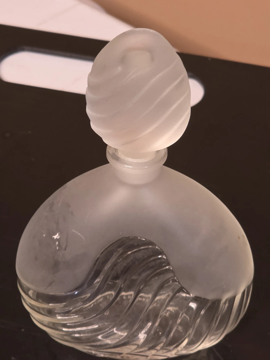 It is made of frosted glass with a clear, wavy base and a matching rounded stopper featuring a swirl design.