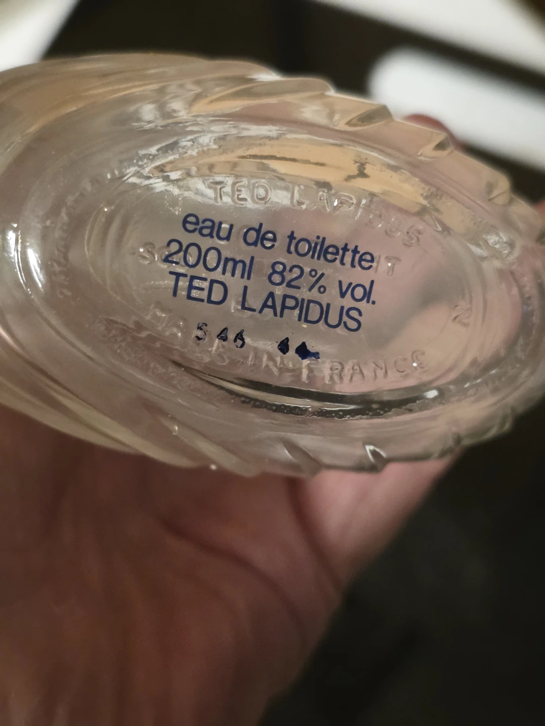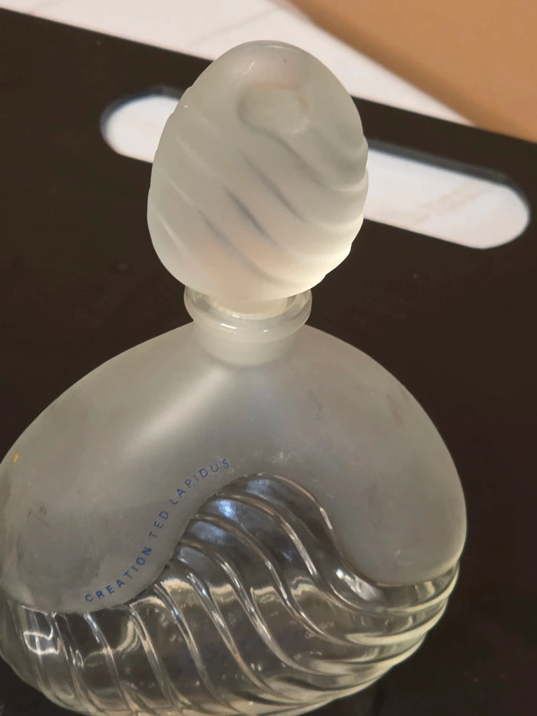 This is a vintage Ted Lapidus Creation perfume bottle with a glass stopper.