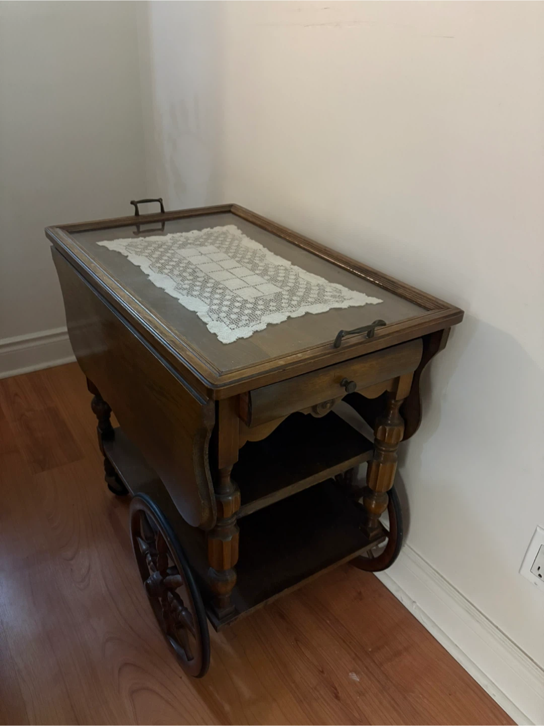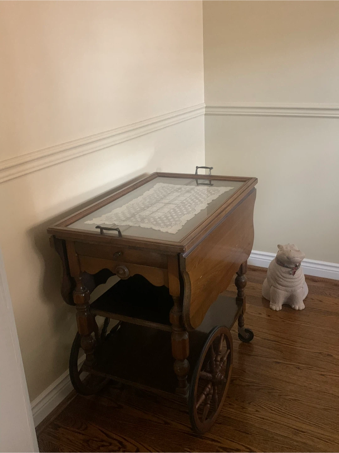 Selling a charming vintage wooden tea cart! It features a classic design with a glass top and a lovely lace doily. Perfect for adding a touch of elegance to your home or for serving tea in style