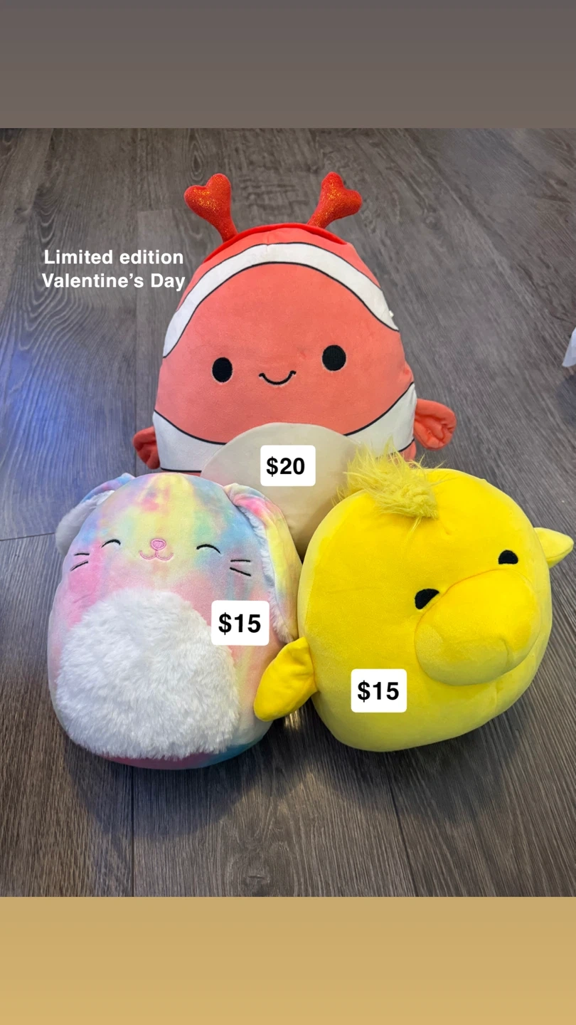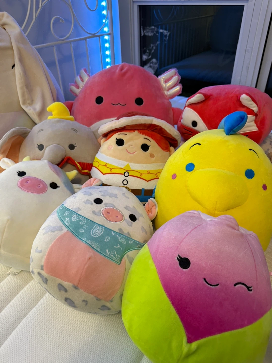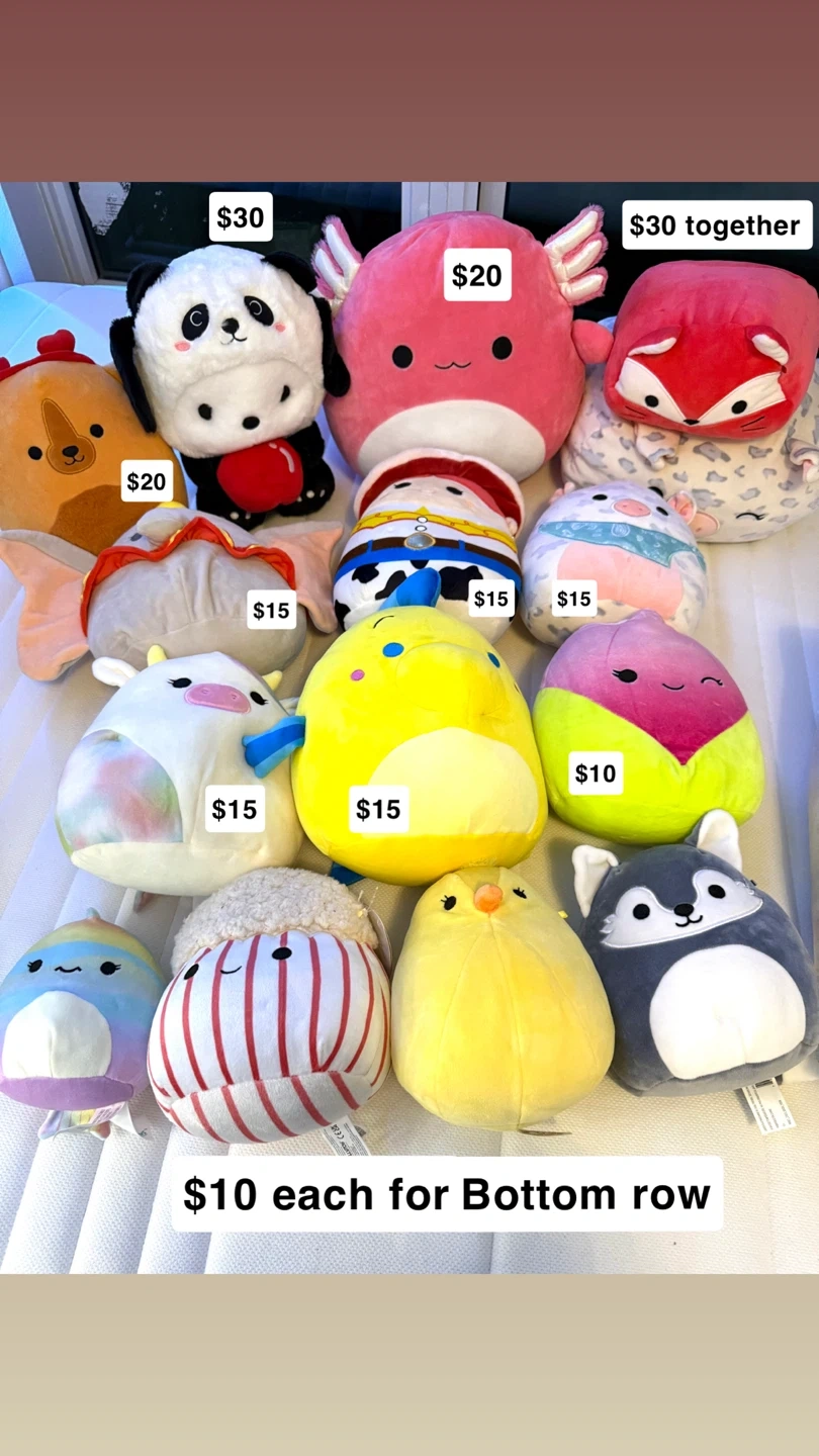 Selling a variety of Squishmallows plush toys! Take a look at the pictures to see the different characters and sizes available. They're all in great condition and ready for a new home. Prices are marked on the photos! Was all bought in America and brought here but selling for cheaper due to no space.