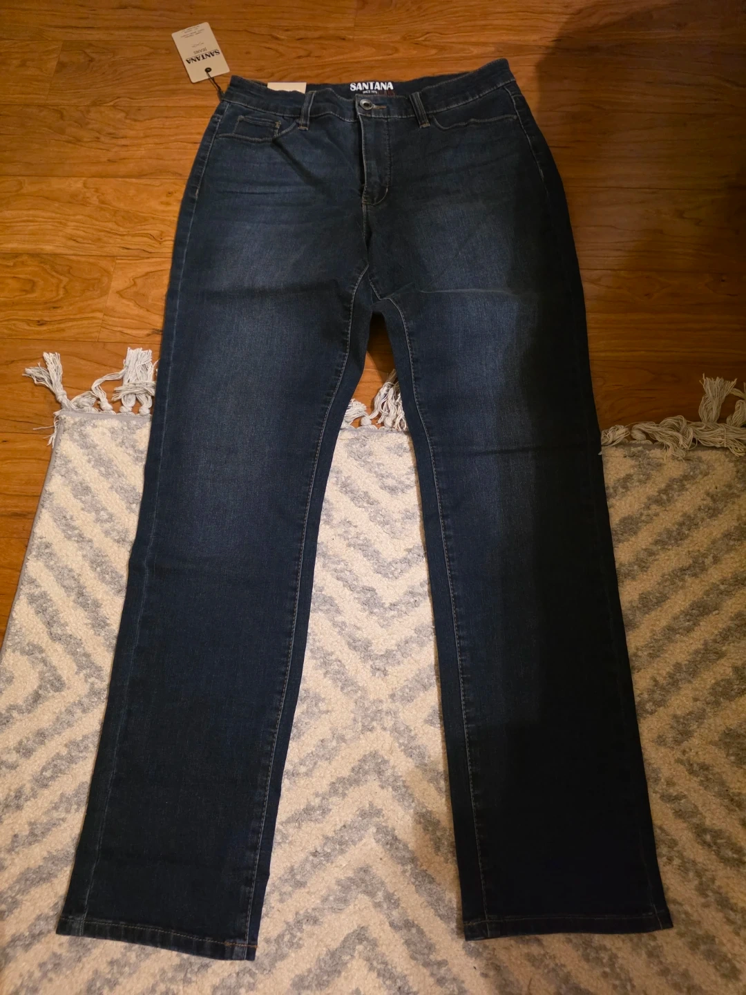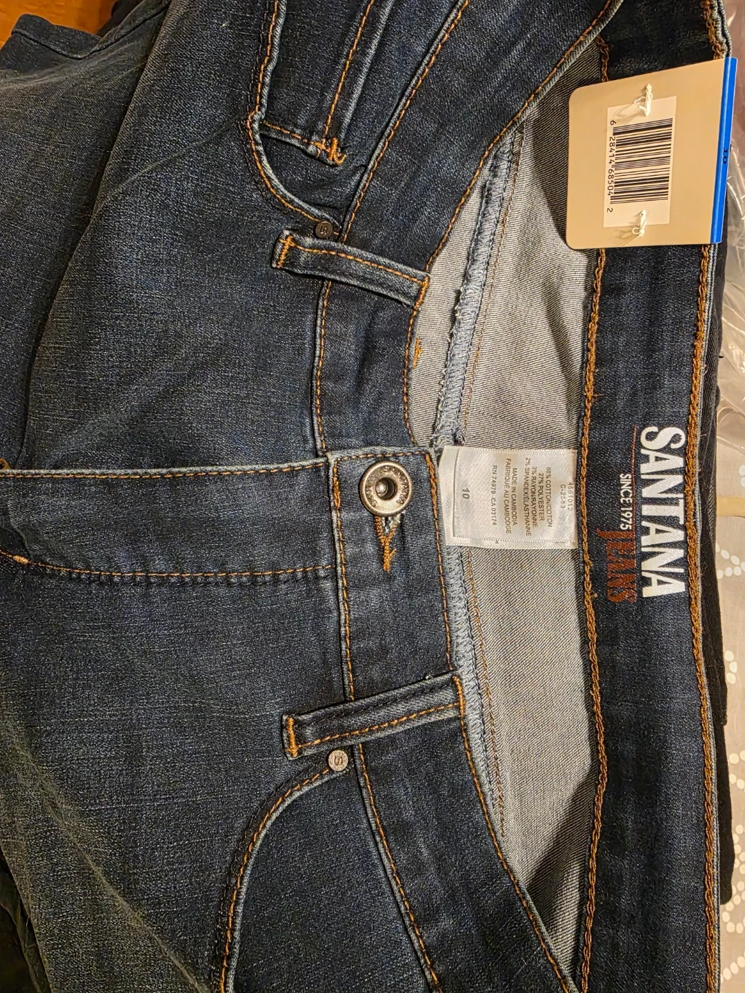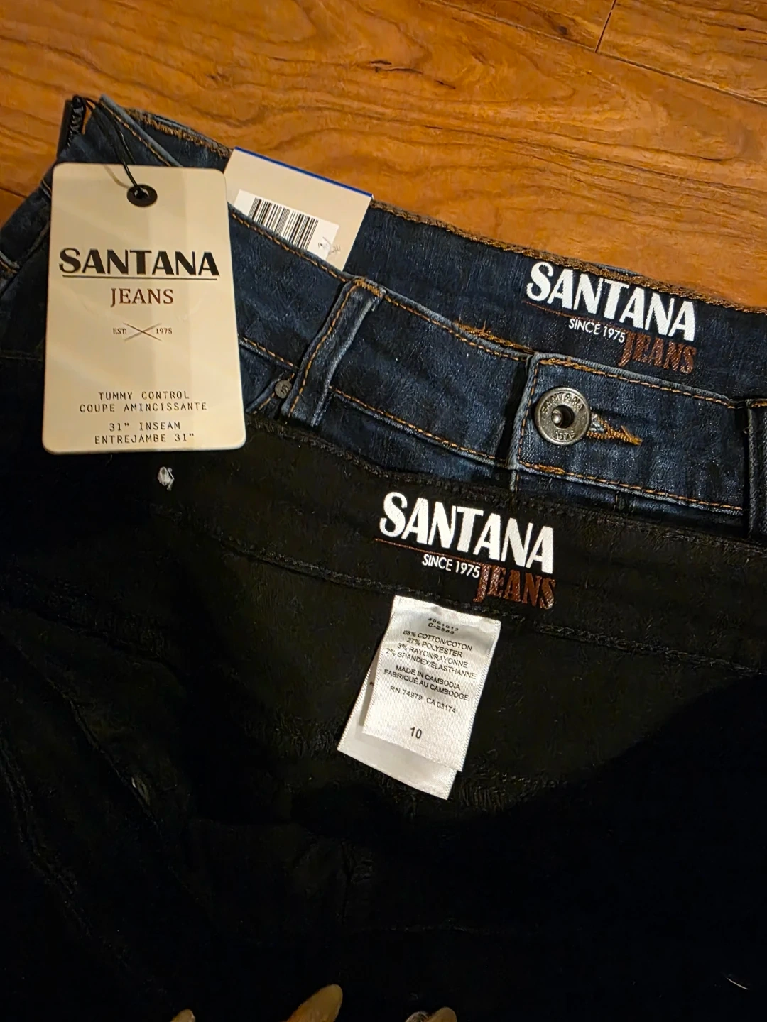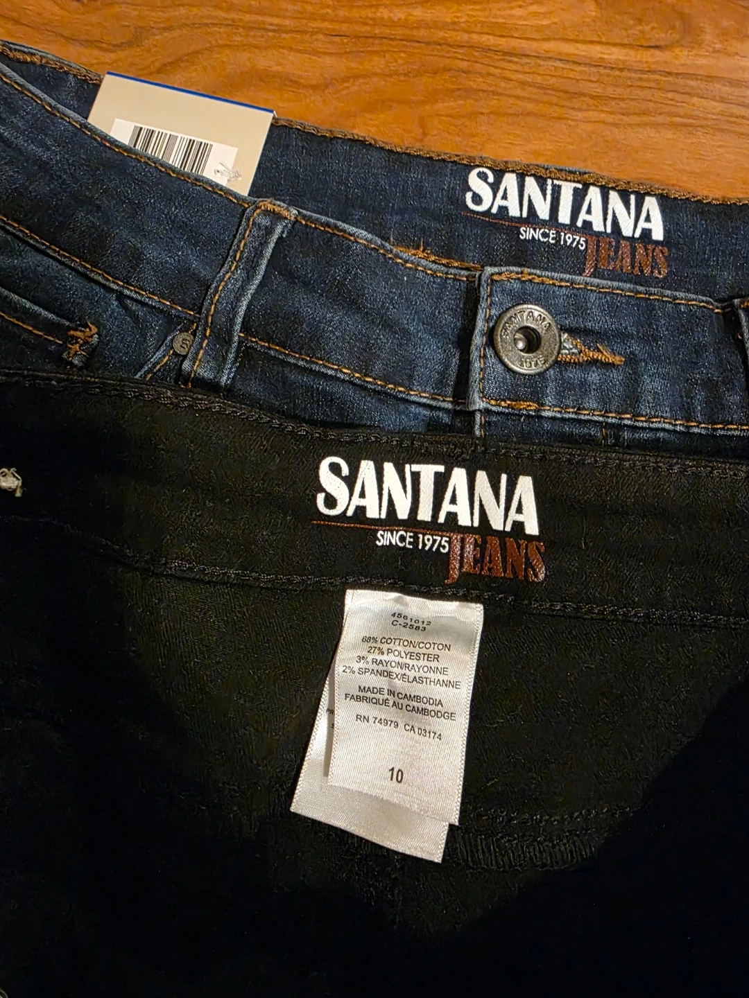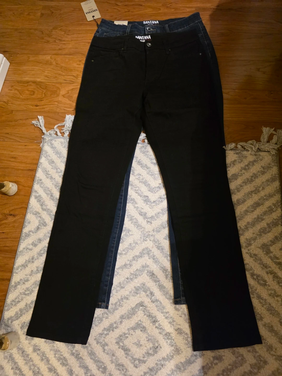Selling a pair of Santana jeans, size 10! They are brand new with tags. The jeans are made of 68% cotton, 29% polyester, and 3% spandex. One pair is dark wash and the other is black!Straight style jeans.