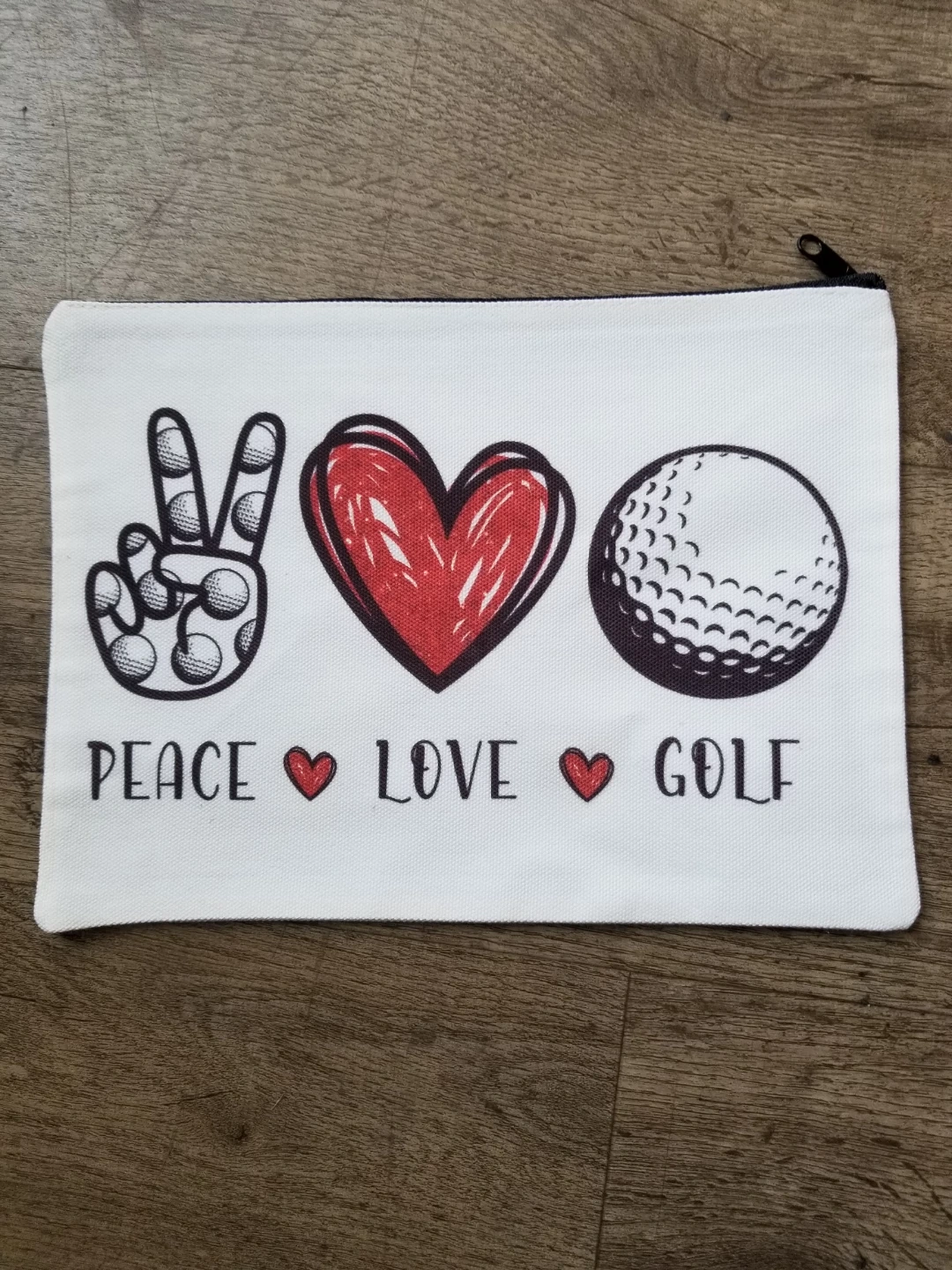 A cute zippered pouch with a fun design! It features a peace sign, a heart, and a golf ball, along with the words "Peace Love Golf". Perfect for carrying small items or as a fun accessory. Brand new